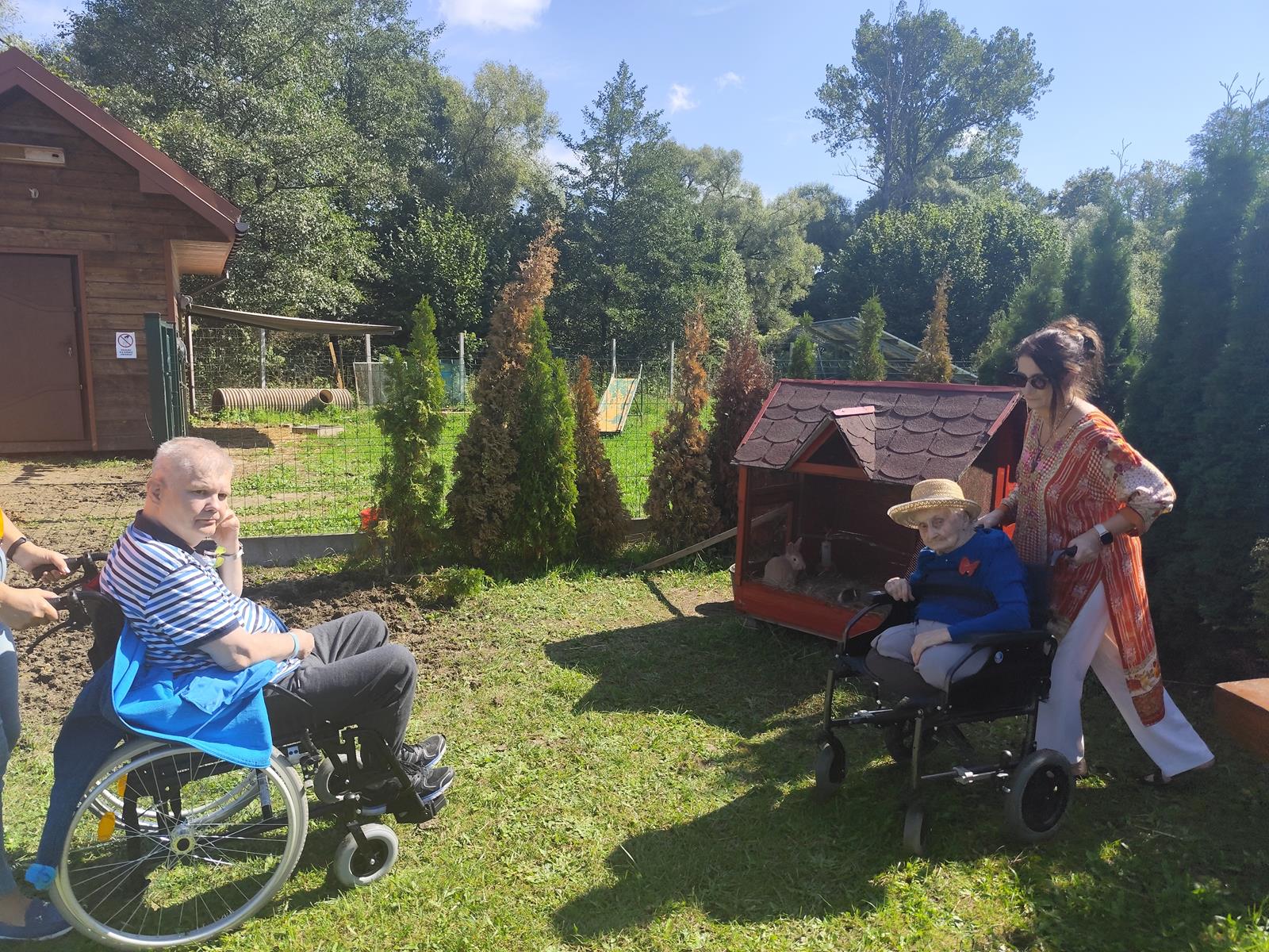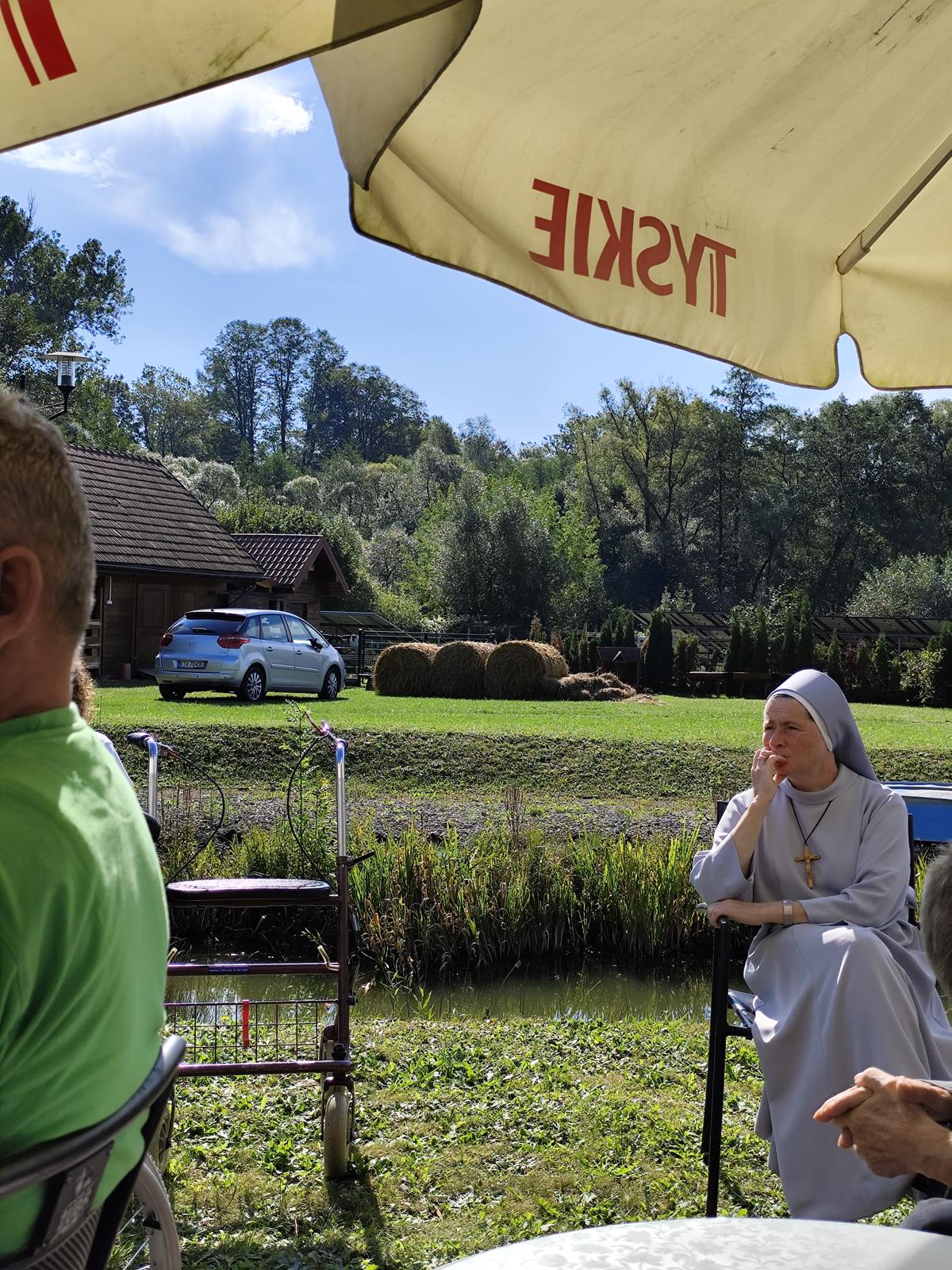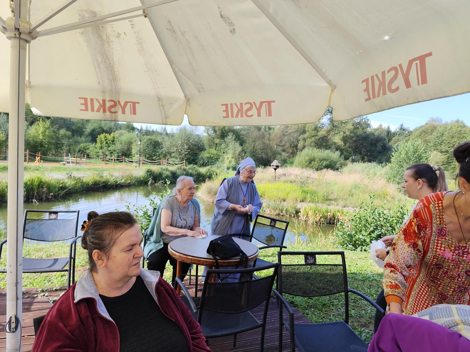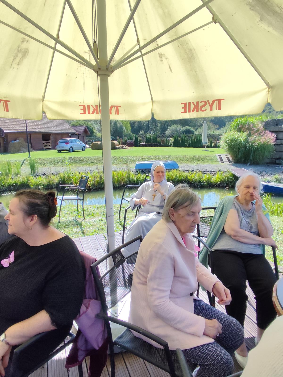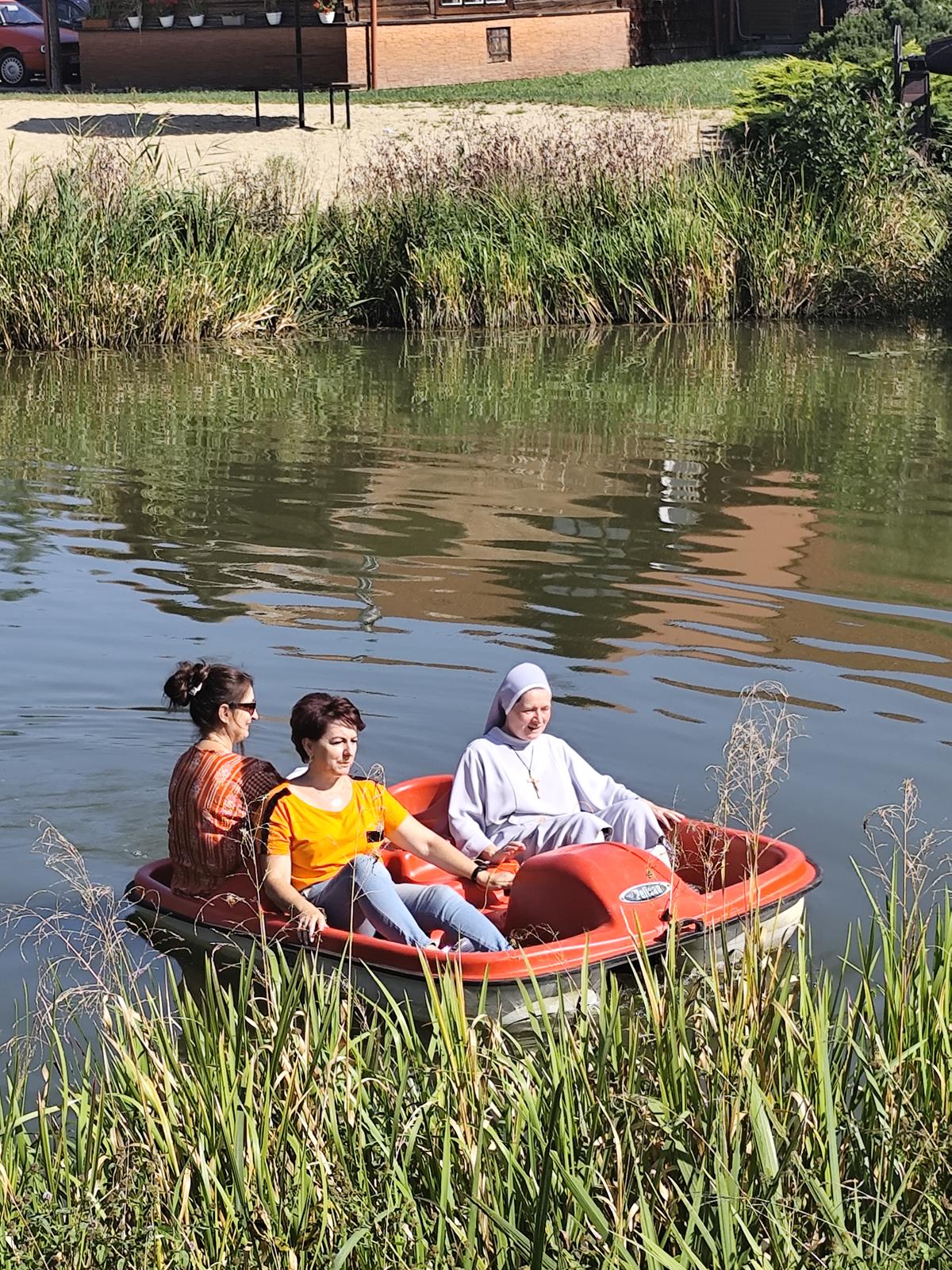 Słoneczna pogoda, piękna sceneria przyrody sprzyjała relaksowi i wspólnemu spędzaniu czasu. Mieszkańcy mogli podziwiać otaczającą zieleń oraz zalew, po którym można było popływać na rowerku wodnym – z tej atrakcji skorzystały najodważniejsze – s. Alfonsa – pracownik socjalny  oraz dwie Renaty (opiekunki). Urok miejsca dopełniały zwierzęta: konie, kozy, które z ciekawością podchodziły do uczestników, sprawiając im wiele radości, króliki, świnki morskie oraz kotki.