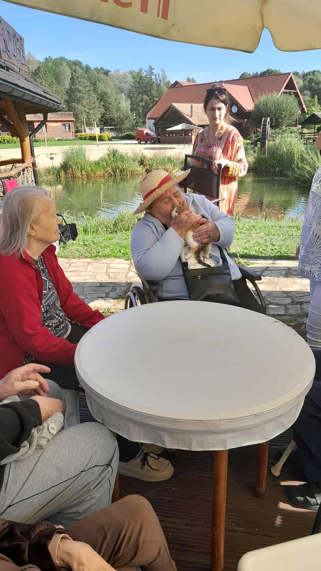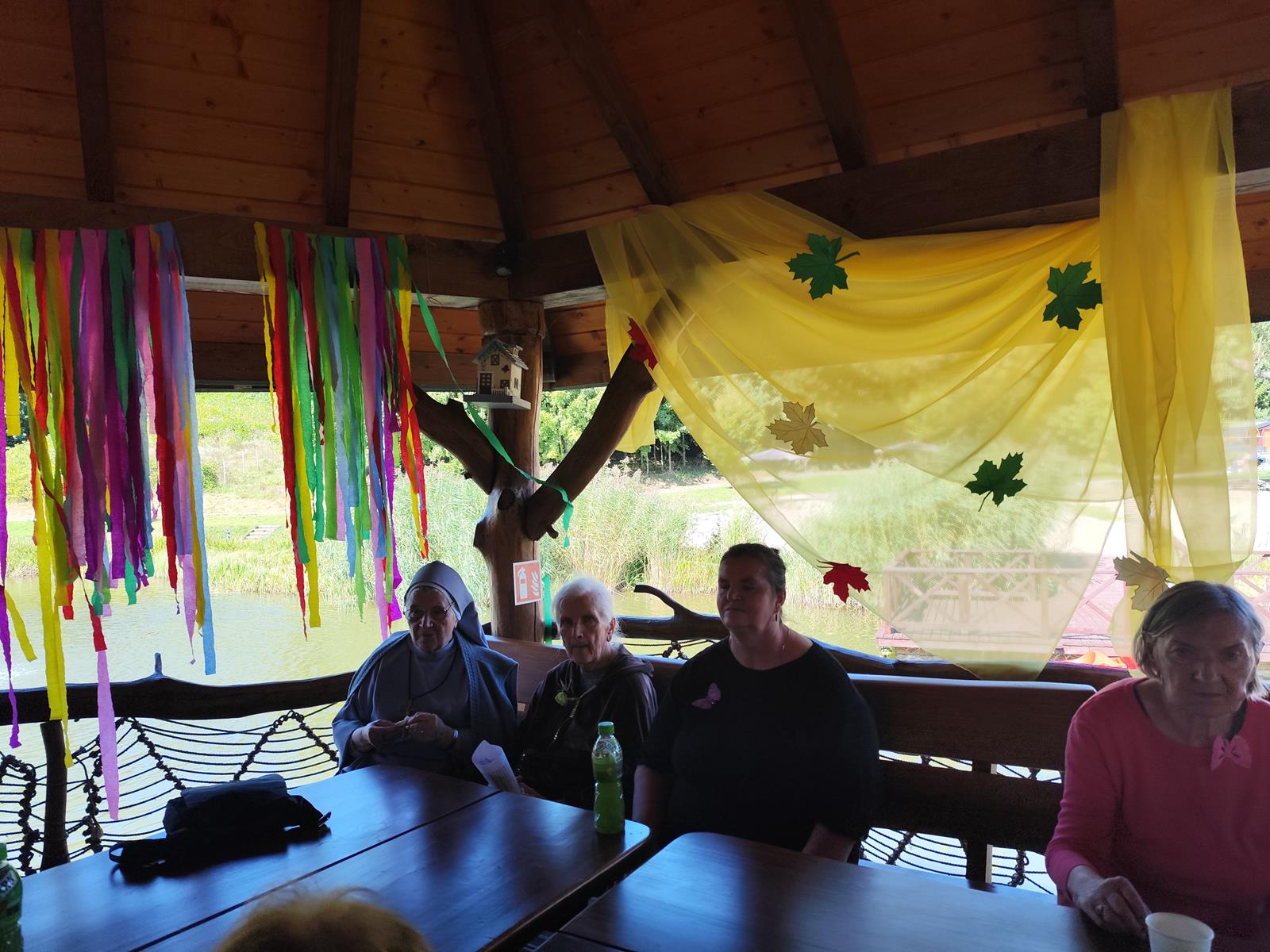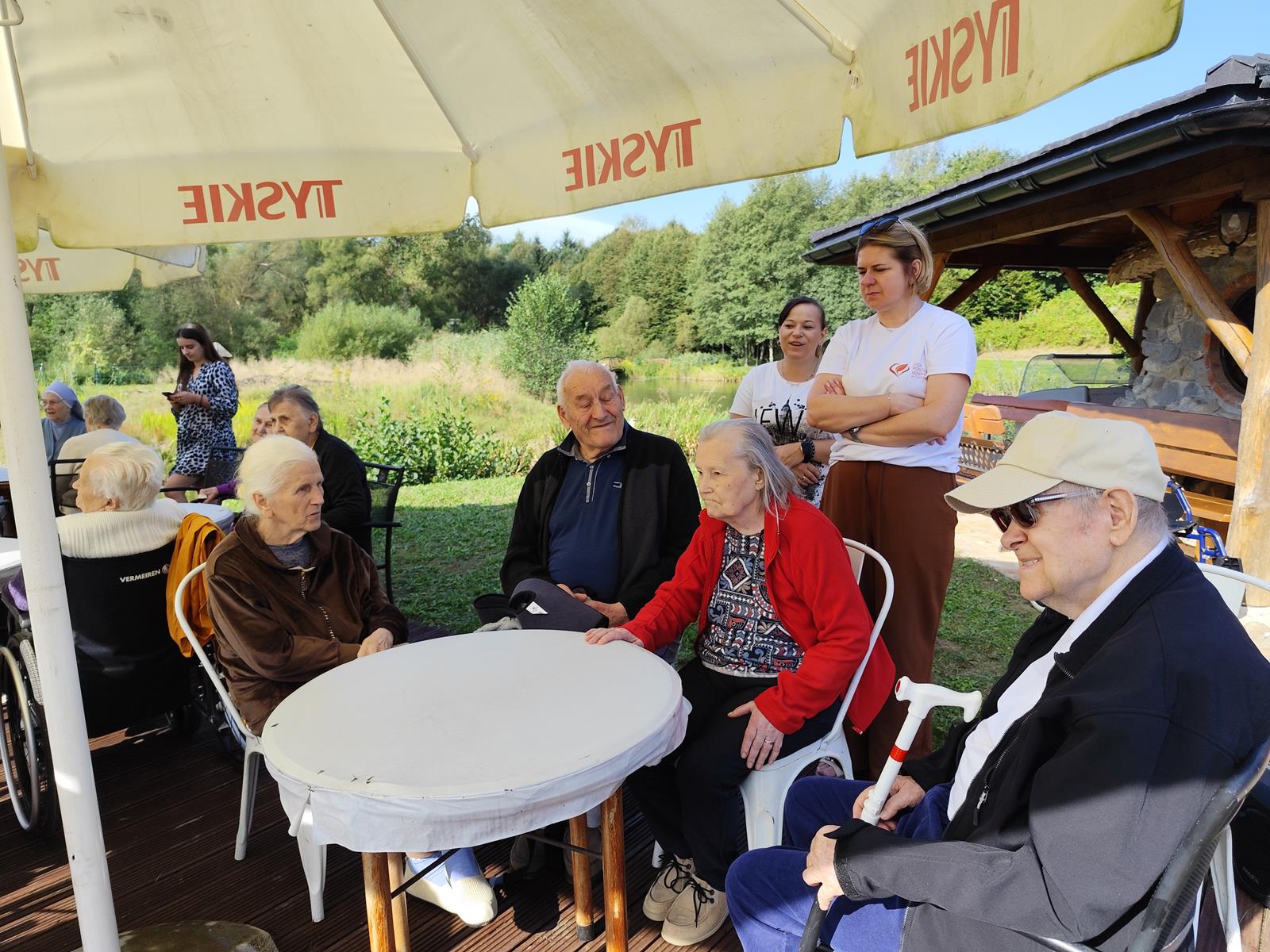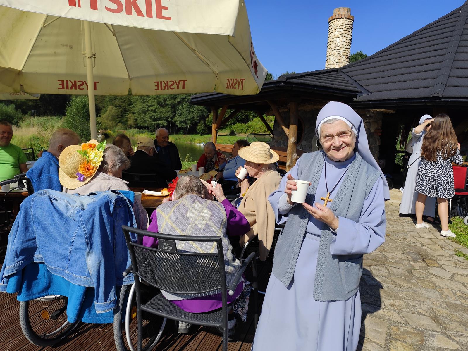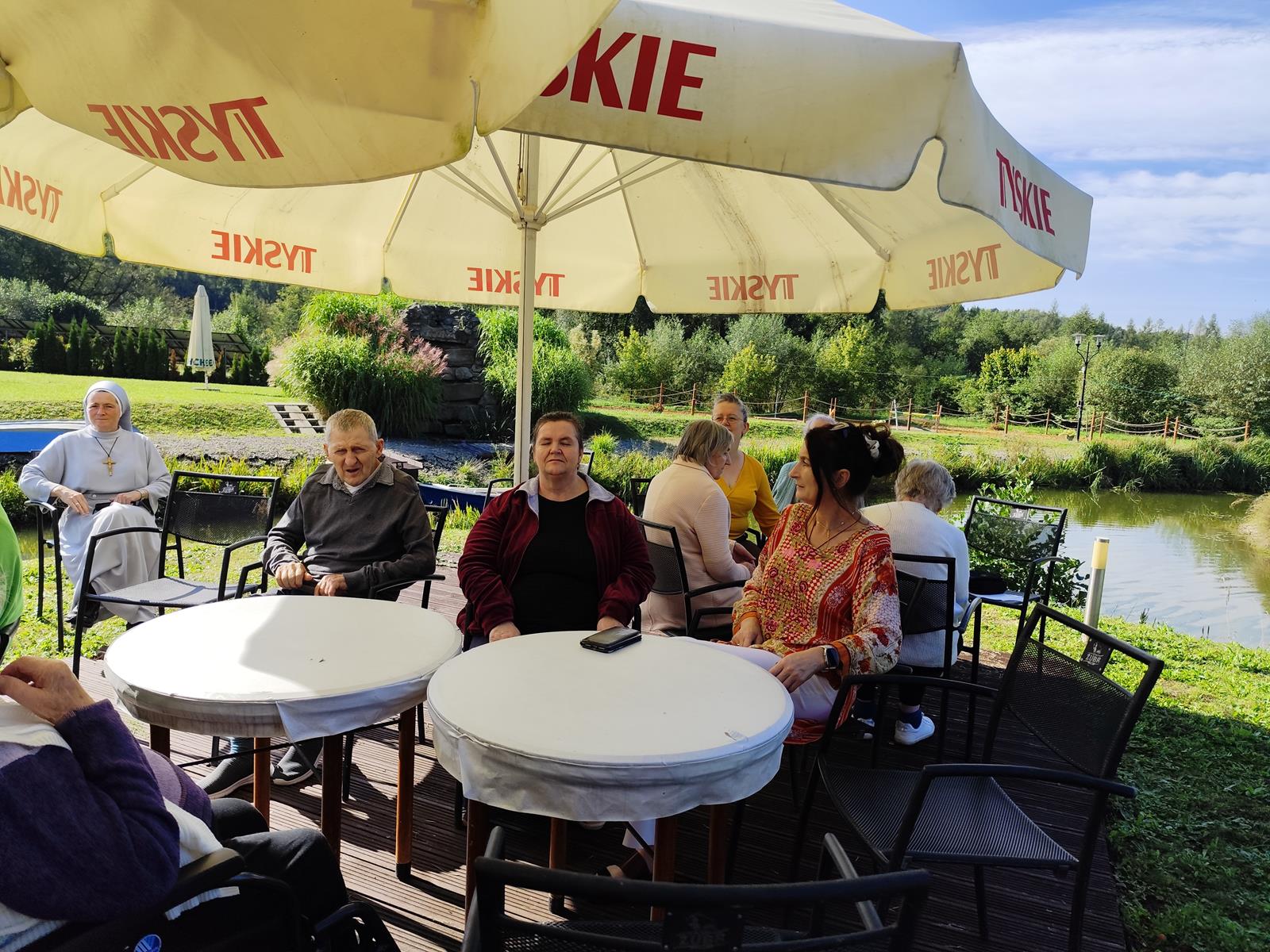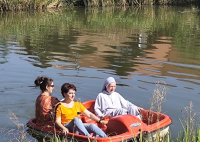 Słoneczna pogoda, piękna sceneria przyrody sprzyjała relaksowi i wspólnemu spędzaniu czasu. Mieszkańcy mogli podziwiać otaczającą zieleń oraz zalew, po którym można było popływać na rowerku wodnym – z tej atrakcji skorzystały najodważniejsze – s. Alfonsa – pracownik socjalny  oraz dwie Renaty (opiekunki). Urok miejsca dopełniały zwierzęta: konie, kozy, które z ciekawością podchodziły do uczestników, sprawiając im wiele radości, króliki, świnki morskie oraz kotki.