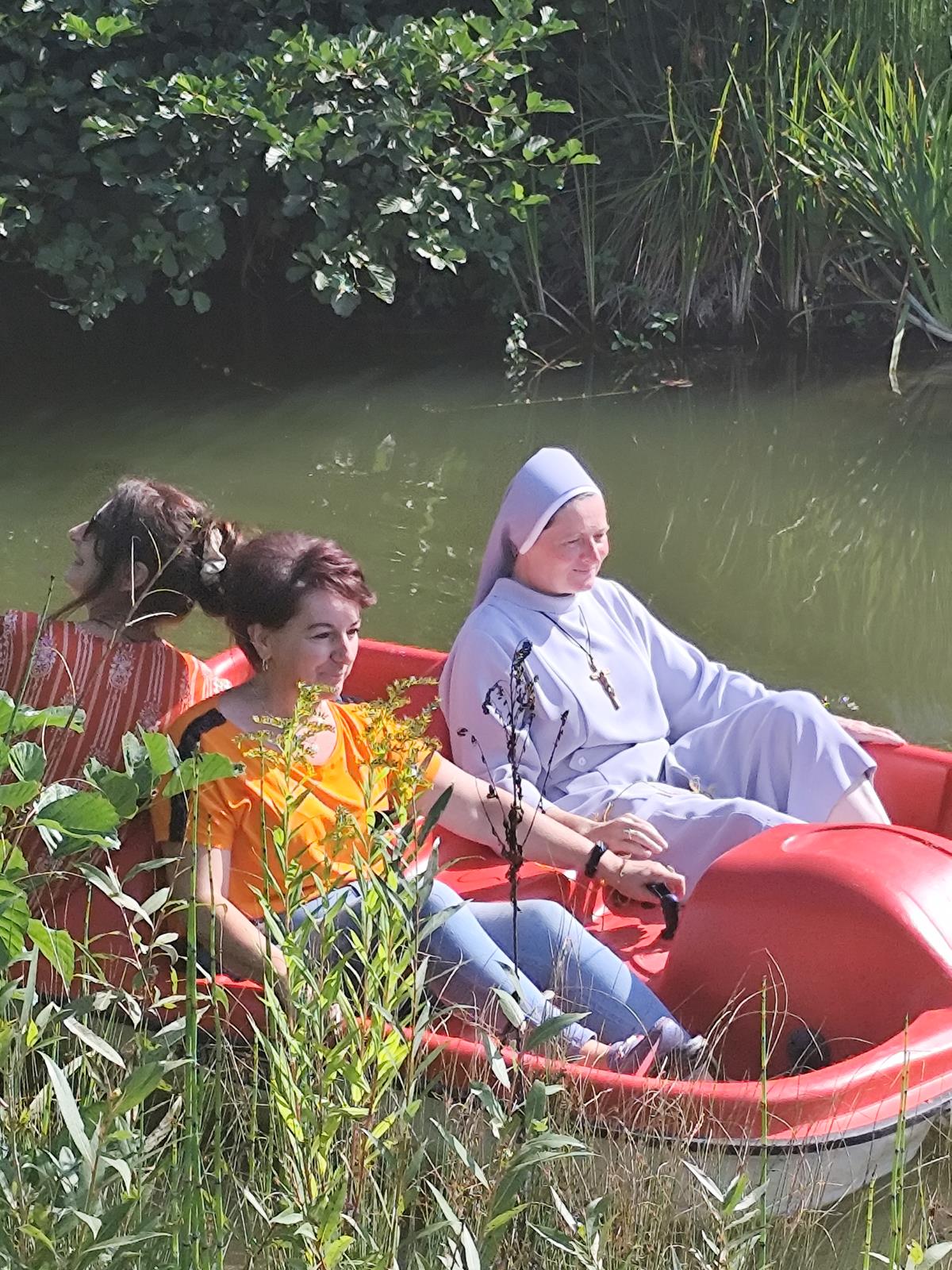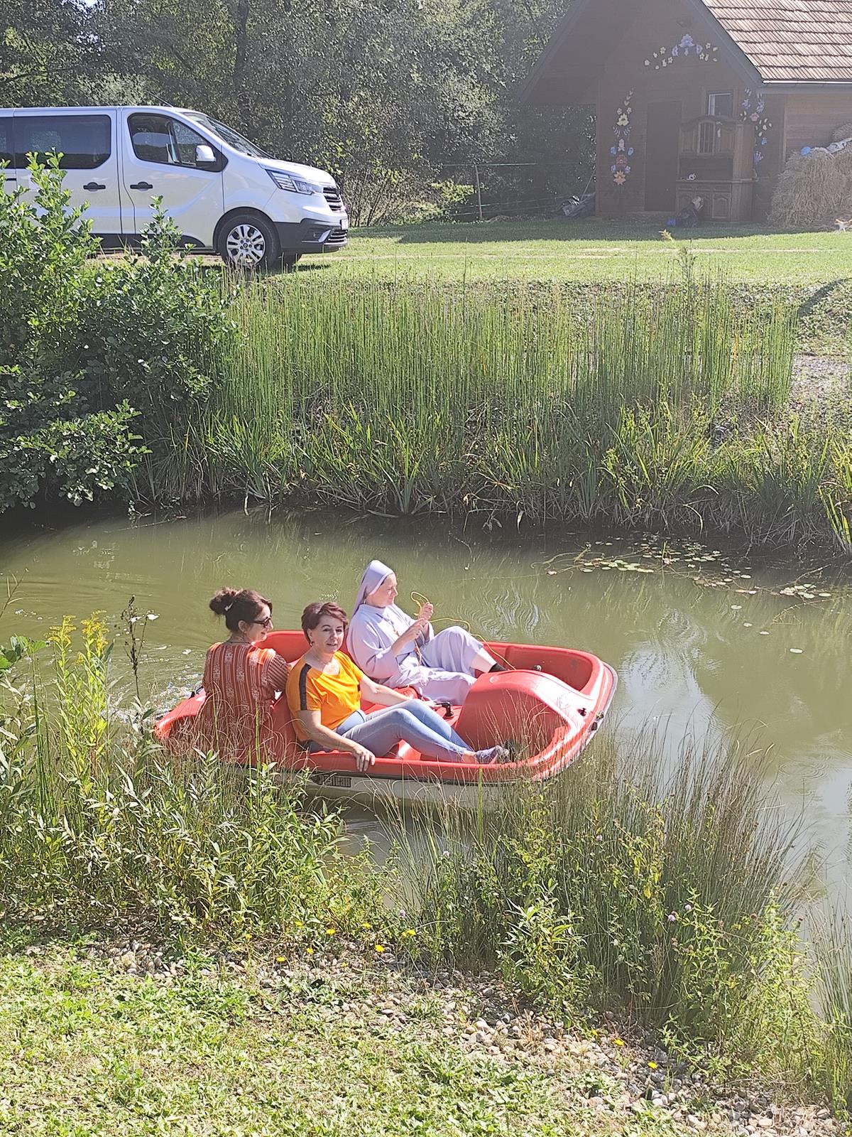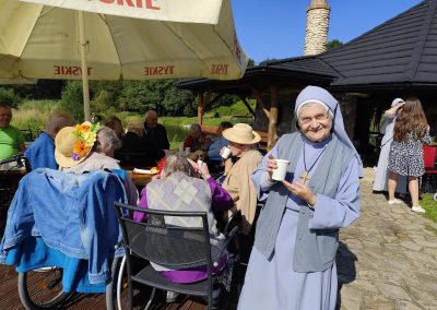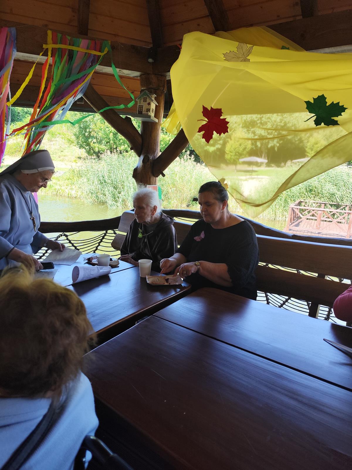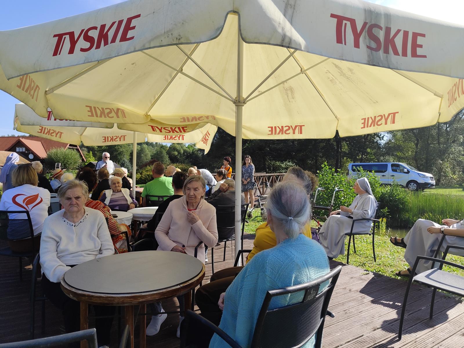 Słoneczna pogoda, piękna sceneria przyrody sprzyjała relaksowi i wspólnemu spędzaniu czasu. Mieszkańcy mogli podziwiać otaczającą zieleń oraz zalew, po którym można było popływać na rowerku wodnym – z tej atrakcji skorzystały najodważniejsze – s. Alfonsa – pracownik socjalny  oraz dwie Renaty (opiekunki). Urok miejsca dopełniały zwierzęta: konie, kozy, które z ciekawością podchodziły do uczestników, sprawiając im wiele radości, króliki, świnki morskie oraz kotki.