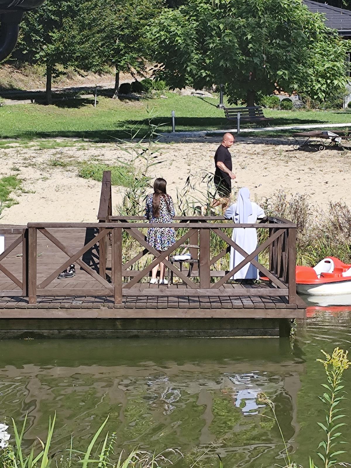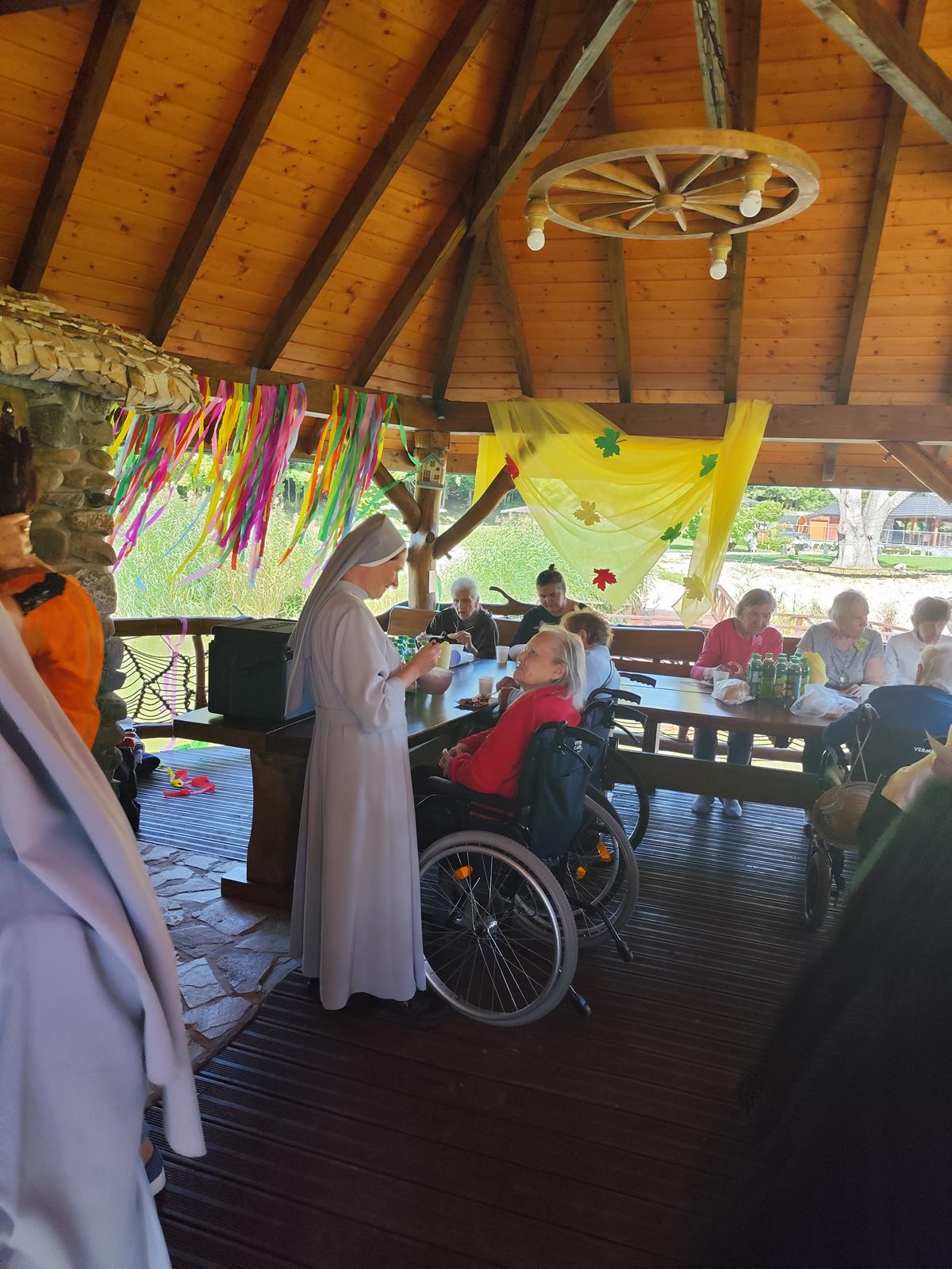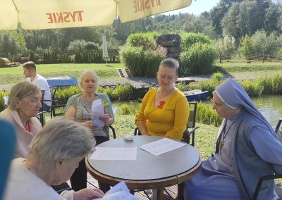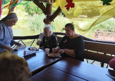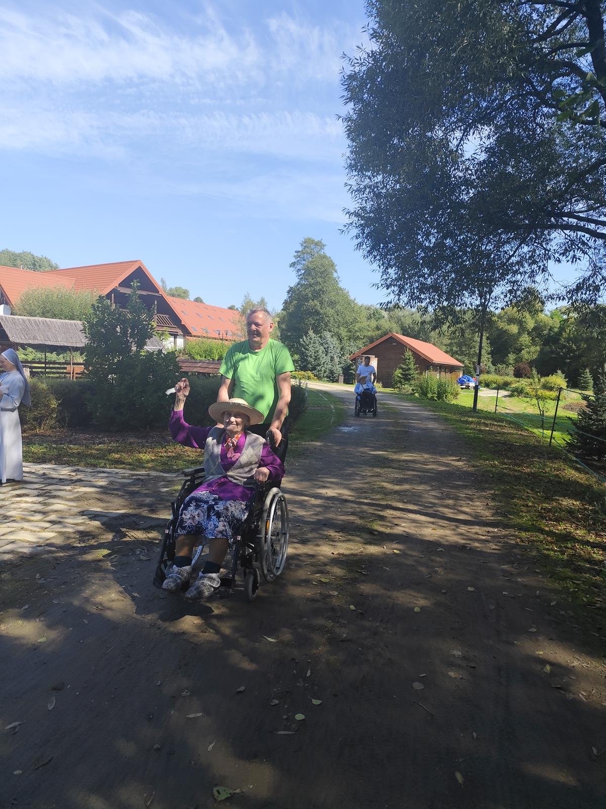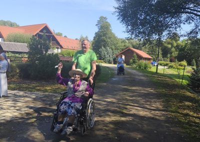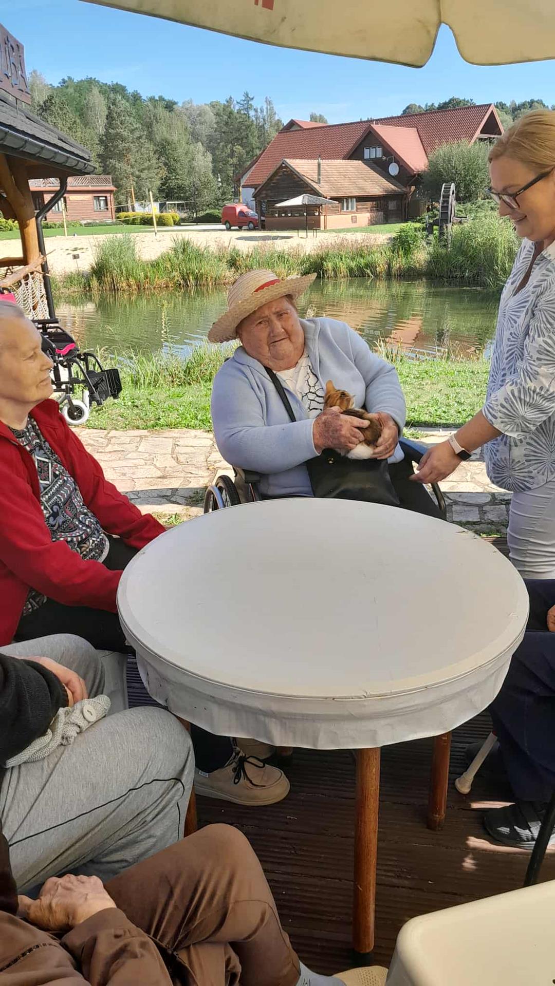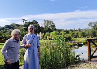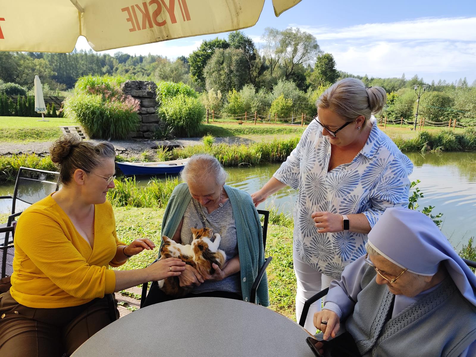Słoneczna pogoda, piękna sceneria przyrody sprzyjała relaksowi i wspólnemu spędzaniu czasu. Mieszkańcy mogli podziwiać otaczającą zieleń oraz zalew, po którym można było popływać na rowerku wodnym – z tej atrakcji skorzystały najodważniejsze – s. Alfonsa – pracownik socjalny  oraz dwie Renaty (opiekunki). Urok miejsca dopełniały zwierzęta: konie, kozy, które z ciekawością podchodziły do uczestników, sprawiając im wiele radości, króliki, świnki morskie oraz kotki.