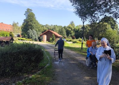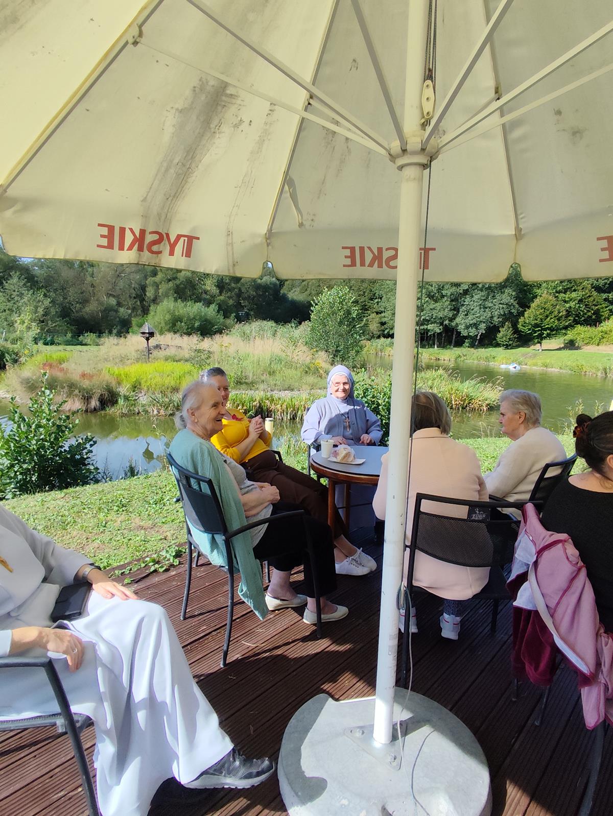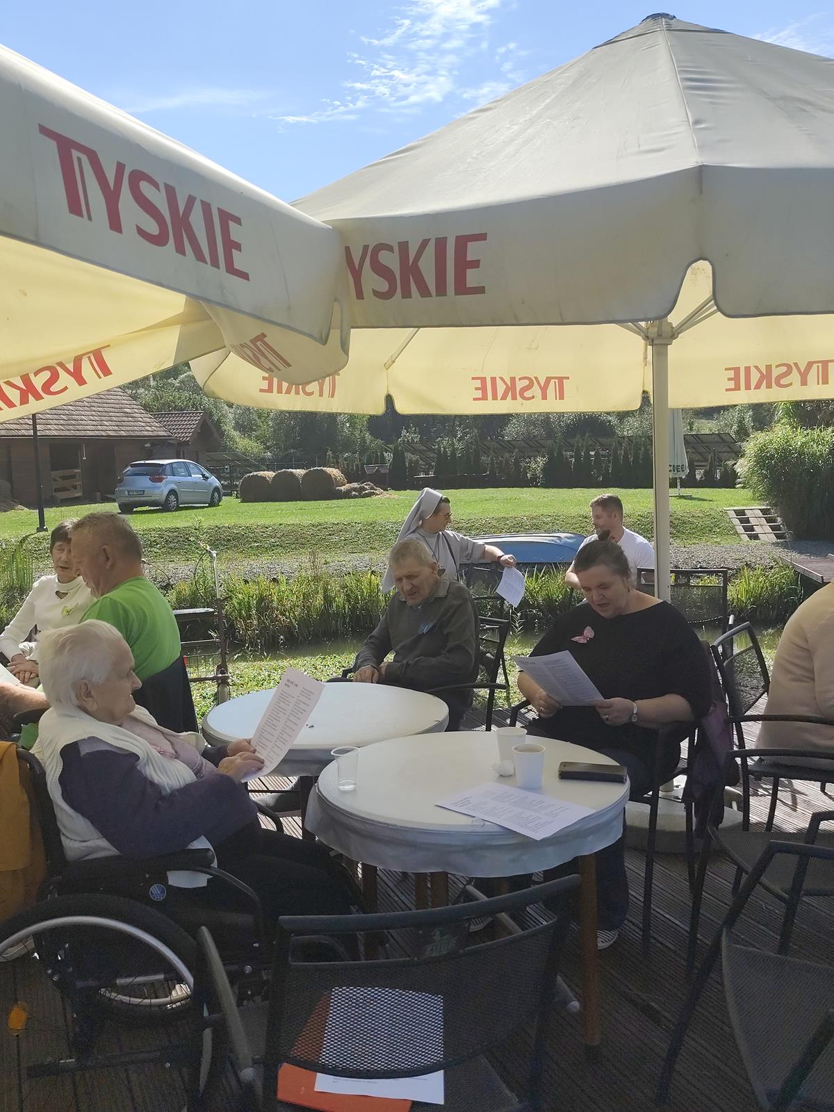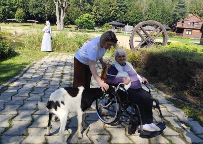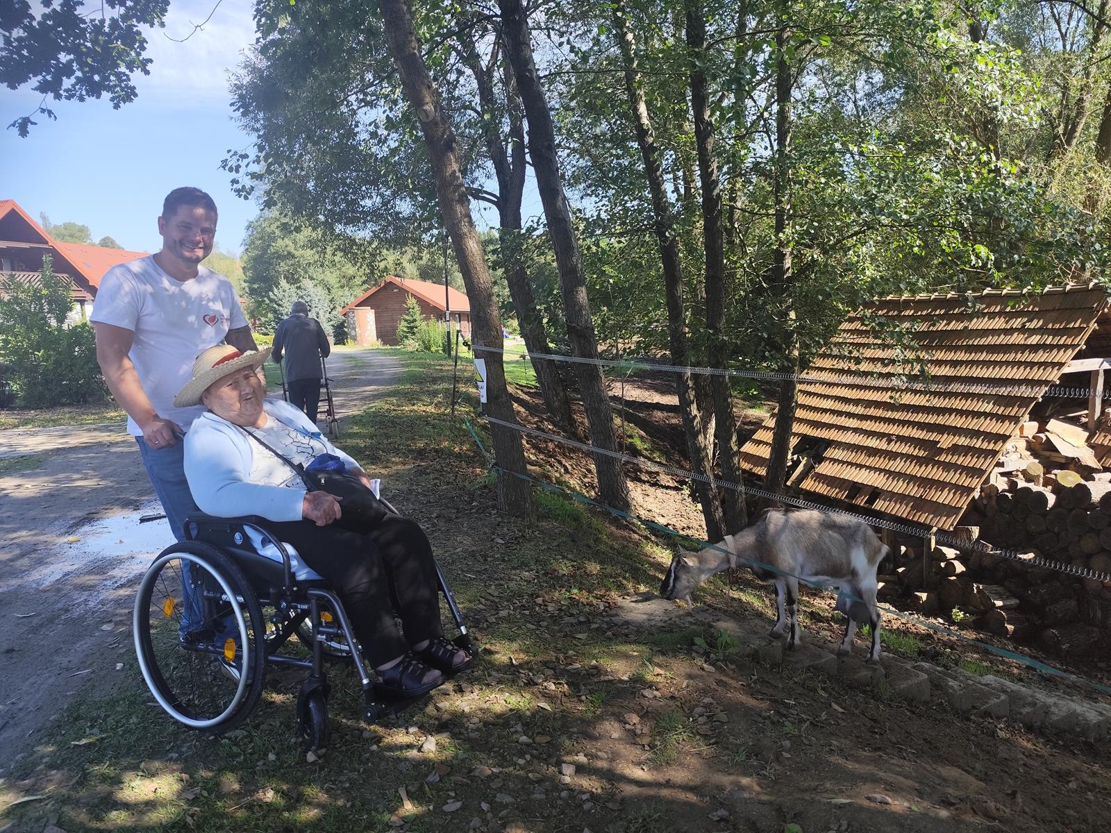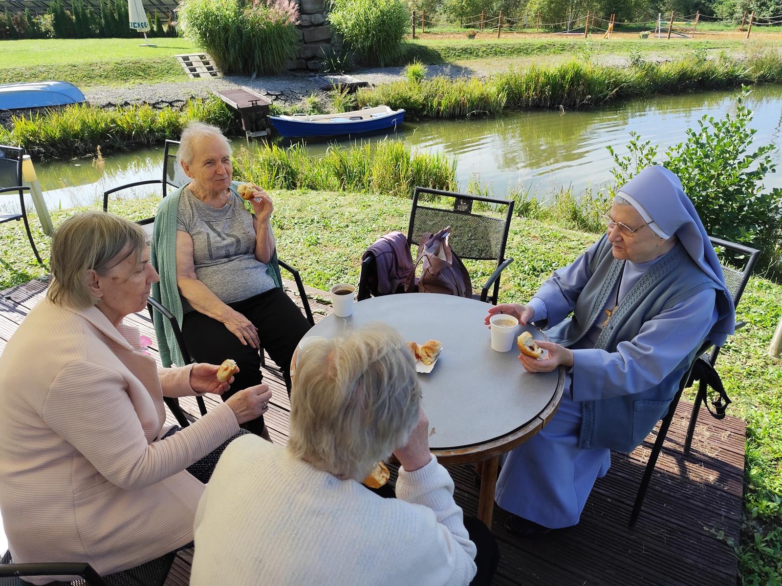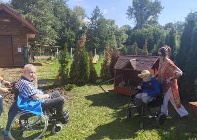 Słoneczna pogoda, piękna sceneria przyrody sprzyjała relaksowi i wspólnemu spędzaniu czasu. Mieszkańcy mogli podziwiać otaczającą zieleń oraz zalew, po którym można było popływać na rowerku wodnym – z tej atrakcji skorzystały najodważniejsze – s. Alfonsa – pracownik socjalny  oraz dwie Renaty (opiekunki). Urok miejsca dopełniały zwierzęta: konie, kozy, które z ciekawością podchodziły do uczestników, sprawiając im wiele radości, króliki, świnki morskie oraz kotki.