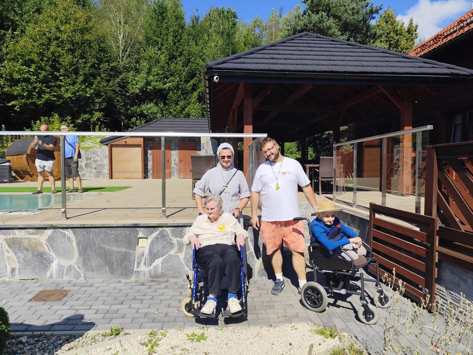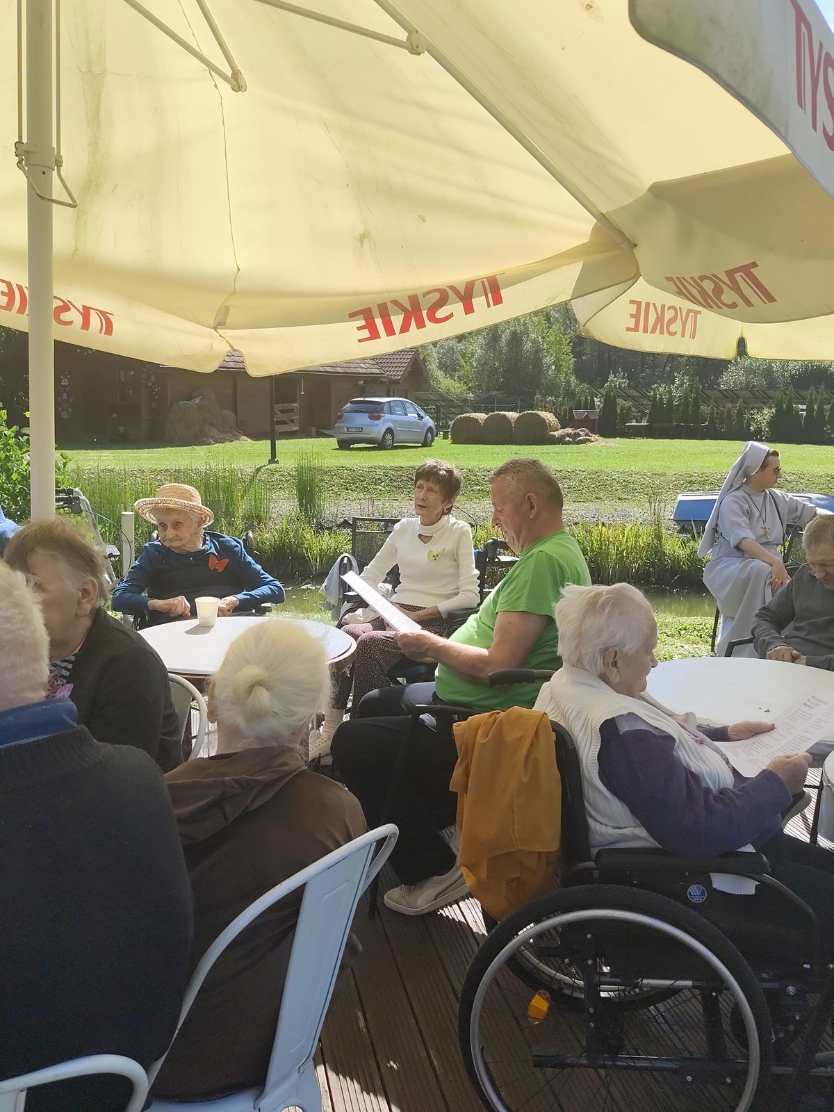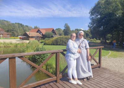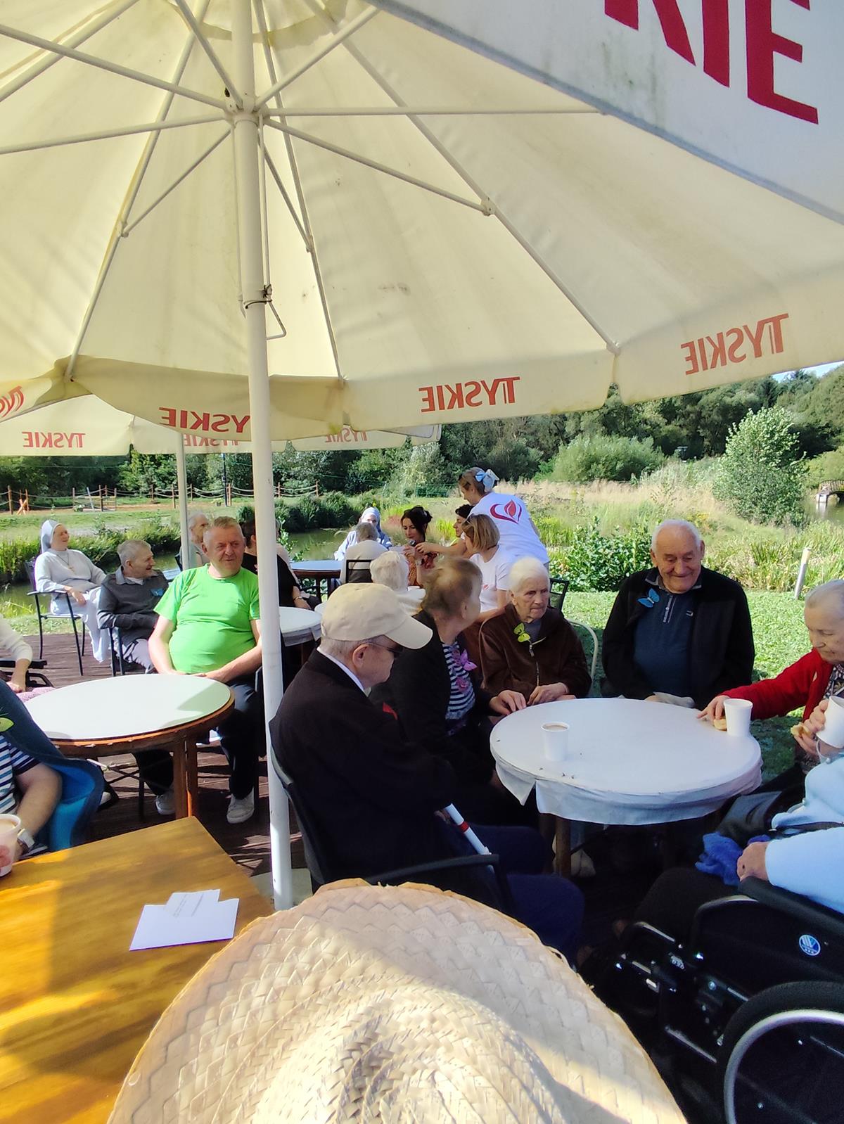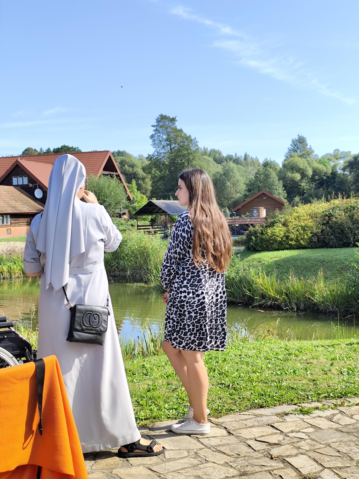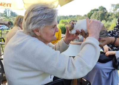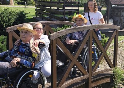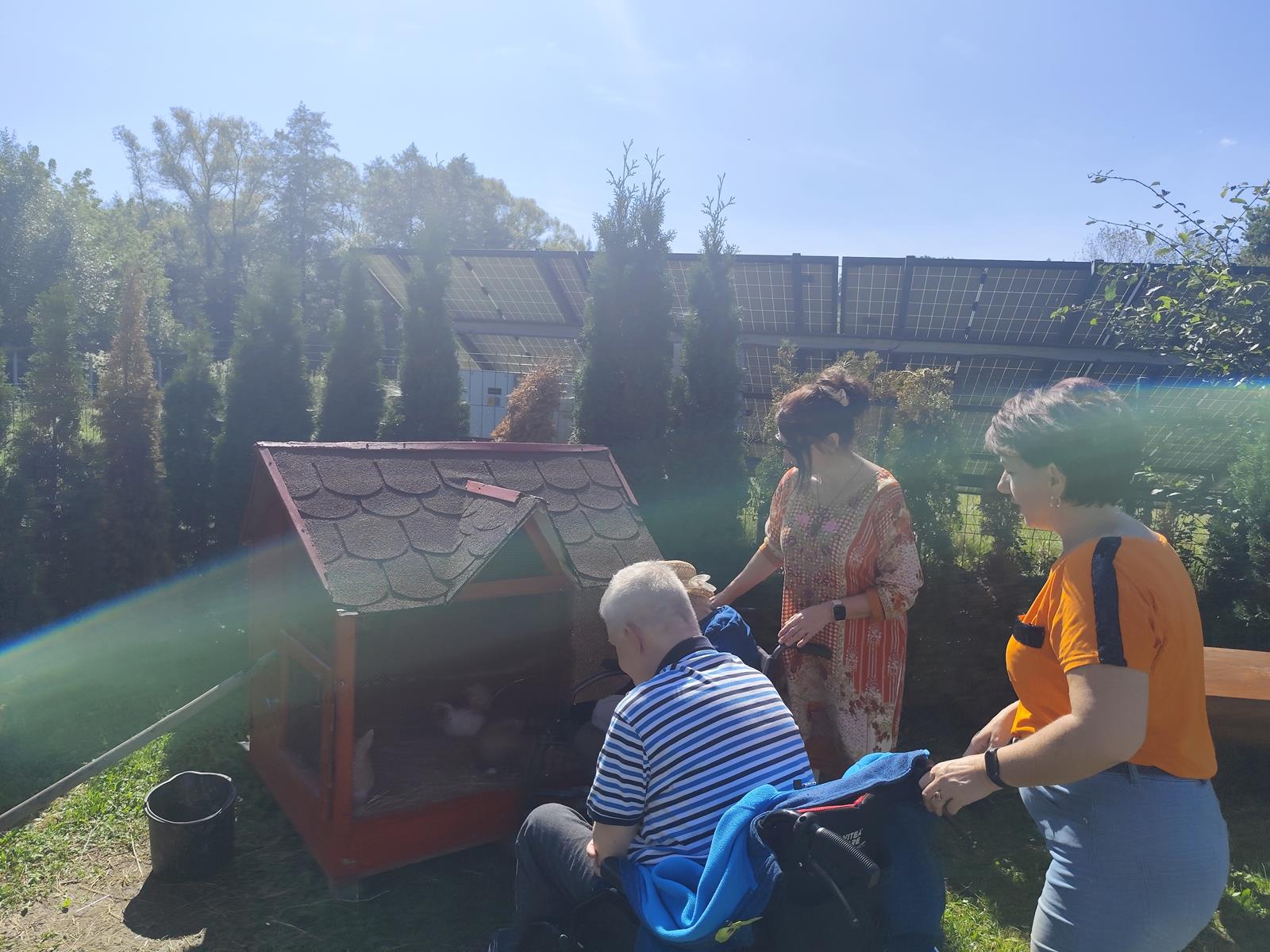 Słoneczna pogoda, piękna sceneria przyrody sprzyjała relaksowi i wspólnemu spędzaniu czasu. Mieszkańcy mogli podziwiać otaczającą zieleń oraz zalew, po którym można było popływać na rowerku wodnym – z tej atrakcji skorzystały najodważniejsze – s. Alfonsa – pracownik socjalny  oraz dwie Renaty (opiekunki). Urok miejsca dopełniały zwierzęta: konie, kozy, które z ciekawością podchodziły do uczestników, sprawiając im wiele radości, króliki, świnki morskie oraz kotki.