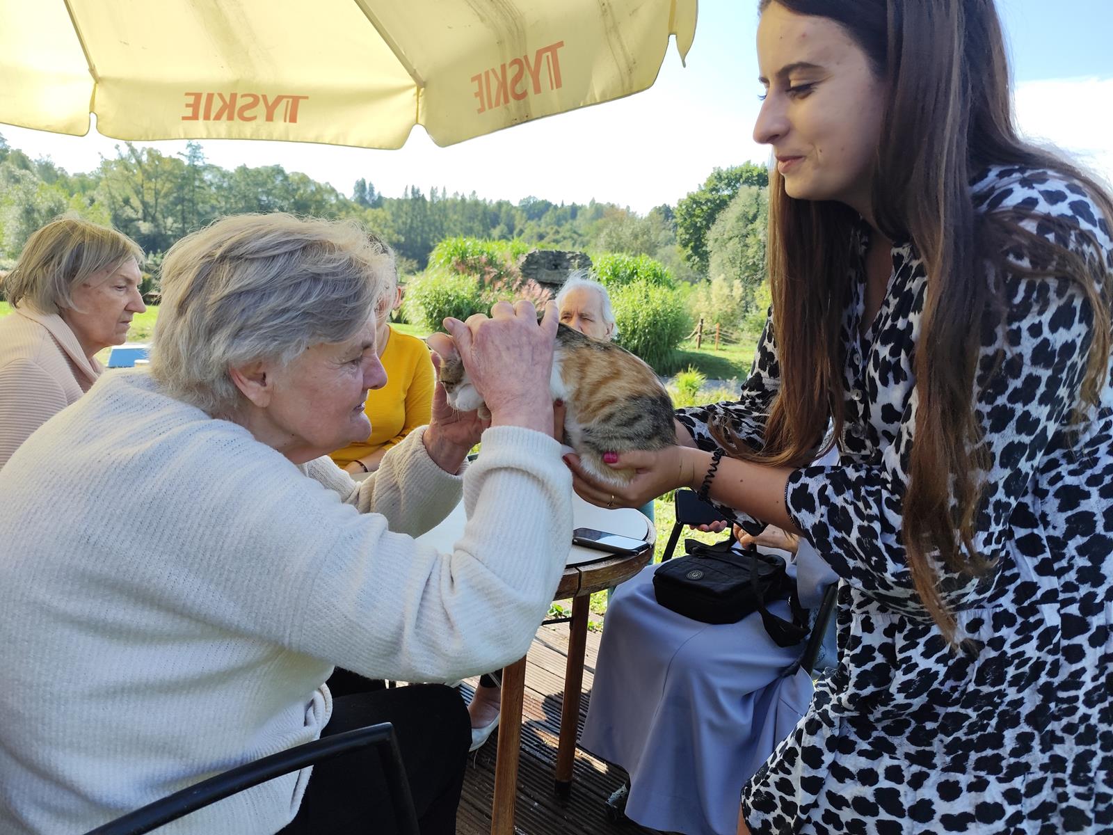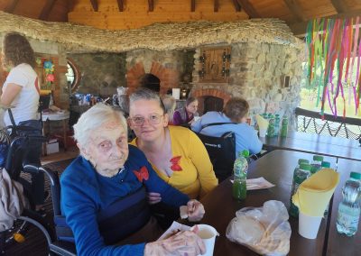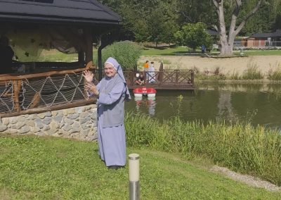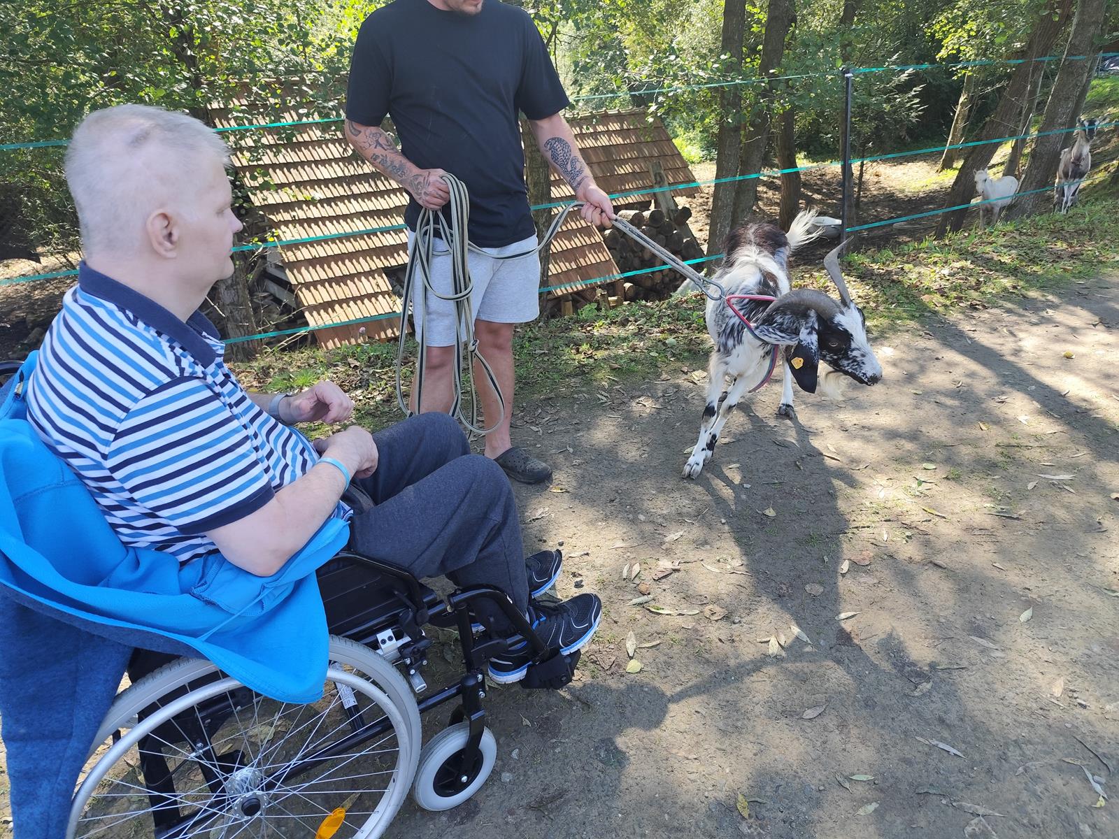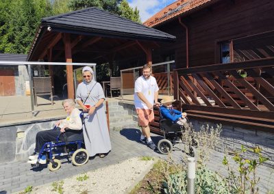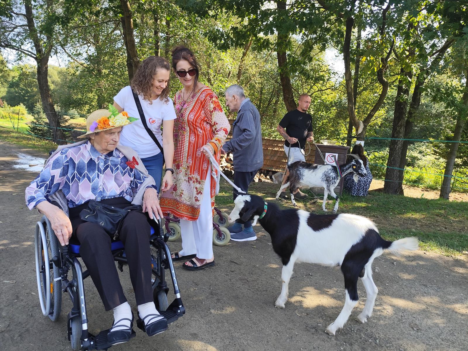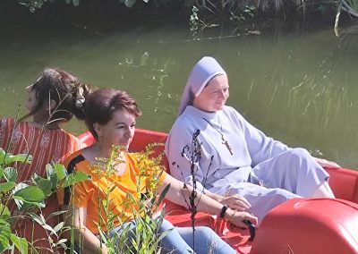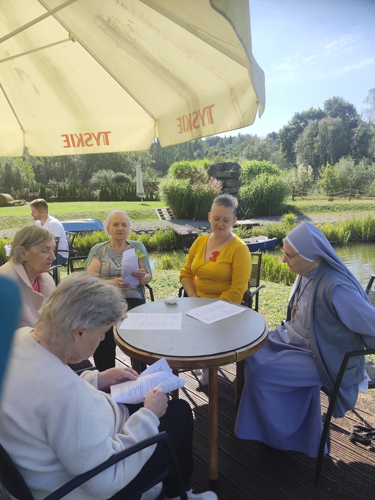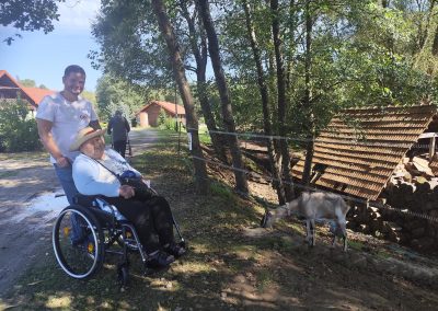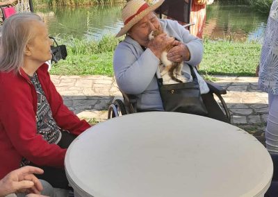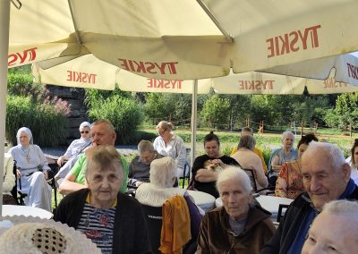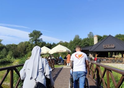 Słoneczna pogoda, piękna sceneria przyrody sprzyjała relaksowi i wspólnemu spędzaniu czasu. Mieszkańcy mogli podziwiać otaczającą zieleń oraz zalew, po którym można było popływać na rowerku wodnym – z tej atrakcji skorzystały najodważniejsze – s. Alfonsa – pracownik socjalny  oraz dwie Renaty (opiekunki). Urok miejsca dopełniały zwierzęta: konie, kozy, które z ciekawością podchodziły do uczestników, sprawiając im wiele radości, króliki, świnki morskie oraz kotki.