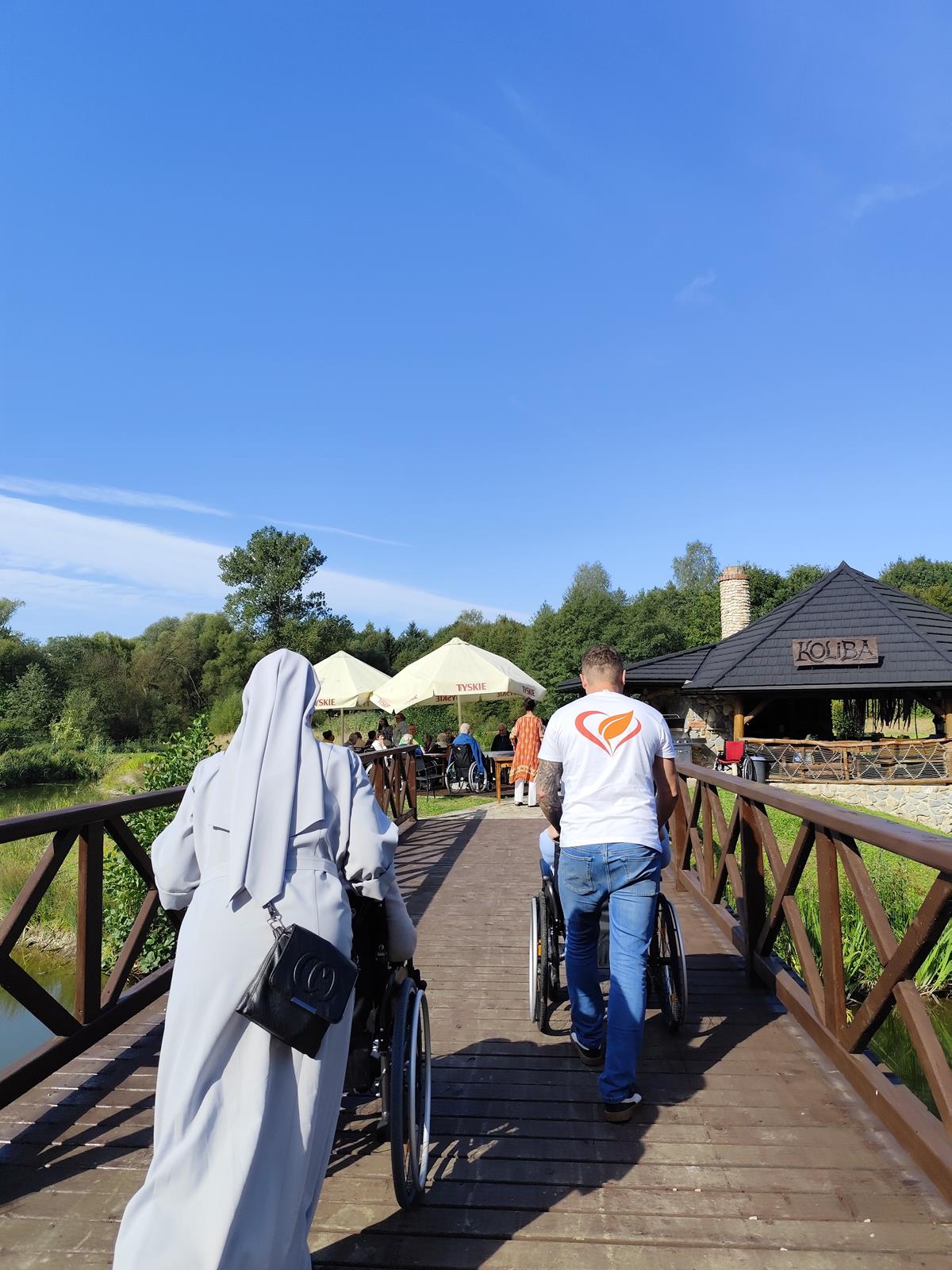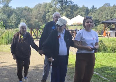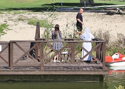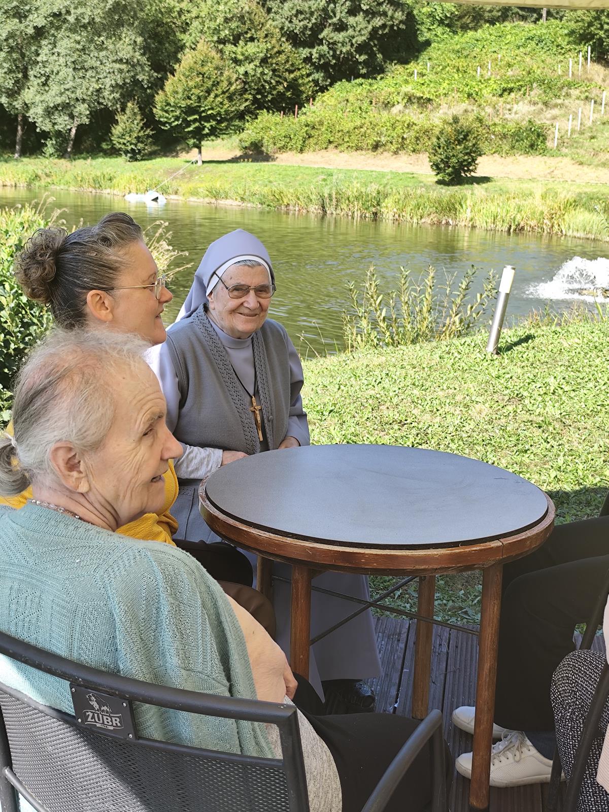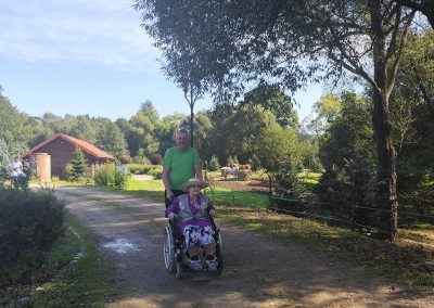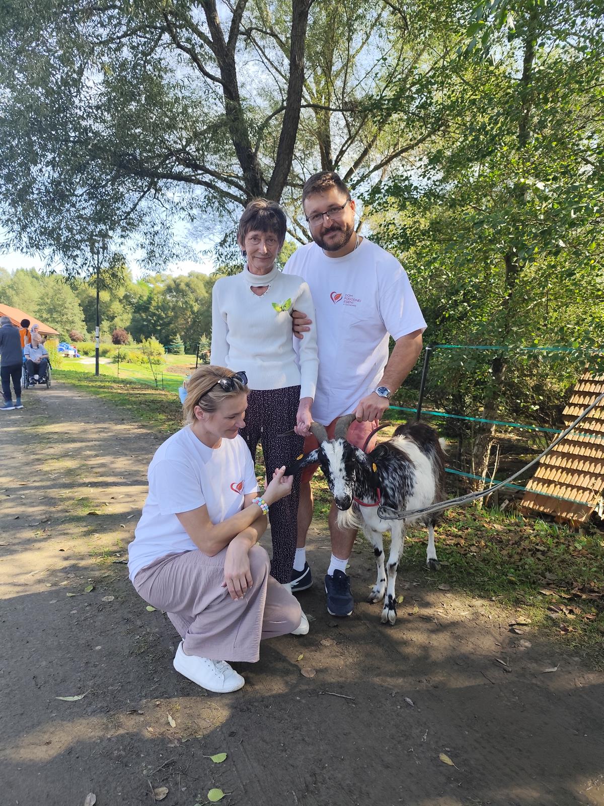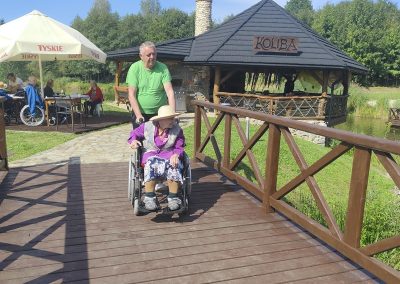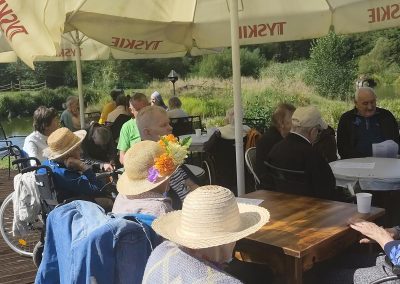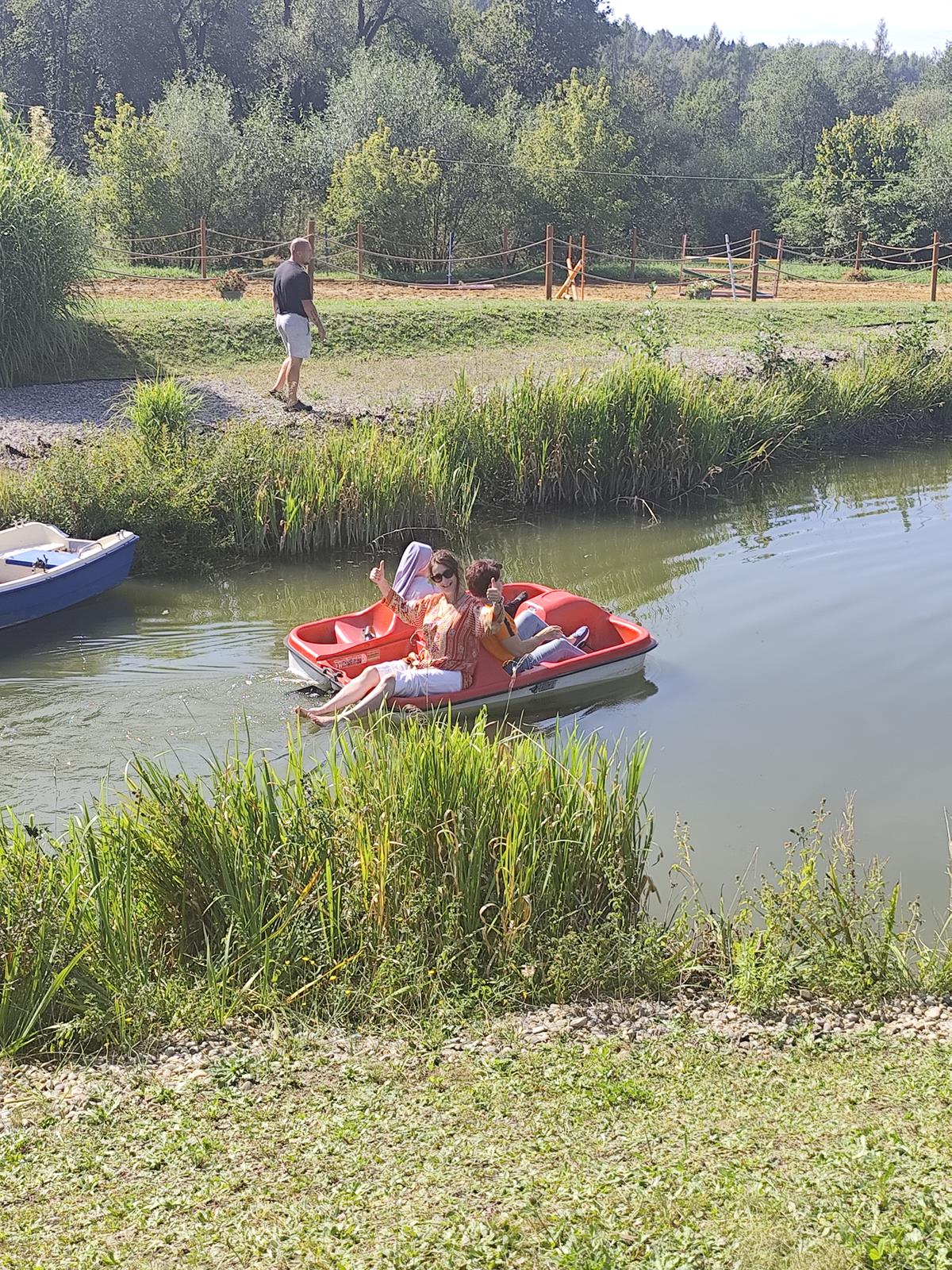 Słoneczna pogoda, piękna sceneria przyrody sprzyjała relaksowi i wspólnemu spędzaniu czasu. Mieszkańcy mogli podziwiać otaczającą zieleń oraz zalew, po którym można było popływać na rowerku wodnym – z tej atrakcji skorzystały najodważniejsze – s. Alfonsa – pracownik socjalny  oraz dwie Renaty (opiekunki). Urok miejsca dopełniały zwierzęta: konie, kozy, które z ciekawością podchodziły do uczestników, sprawiając im wiele radości, króliki, świnki morskie oraz kotki.
