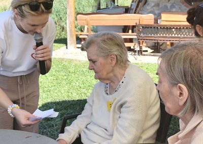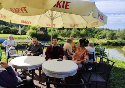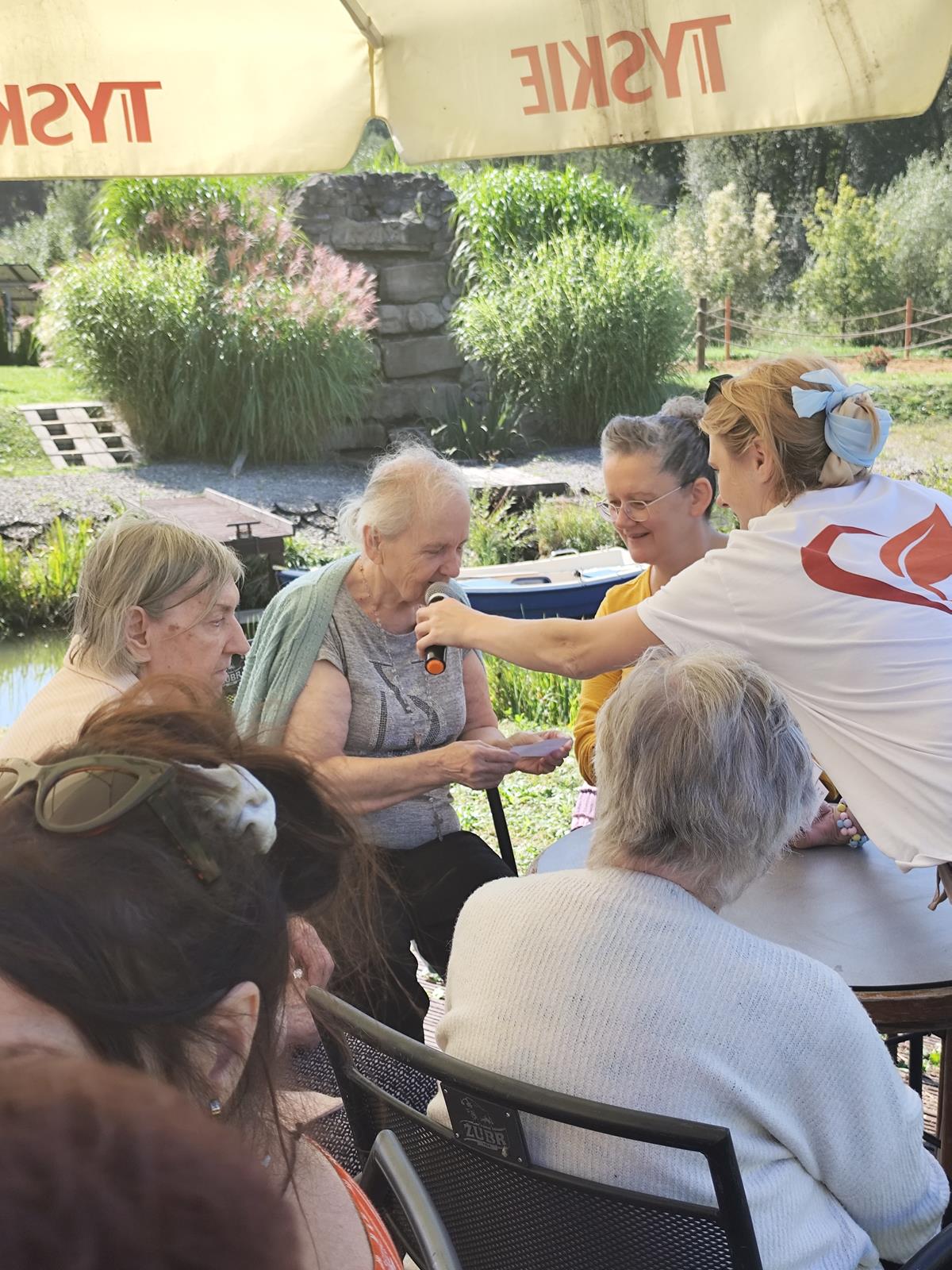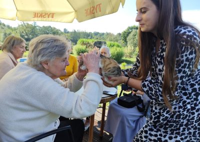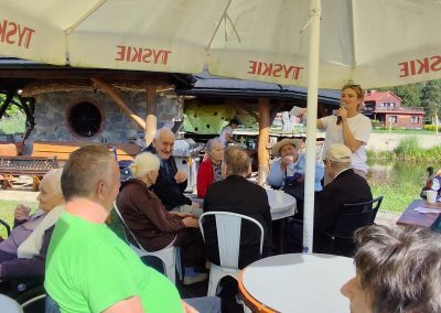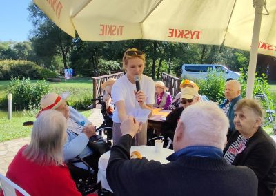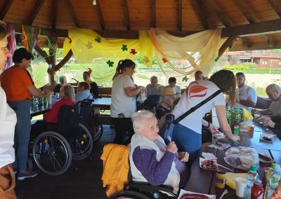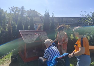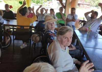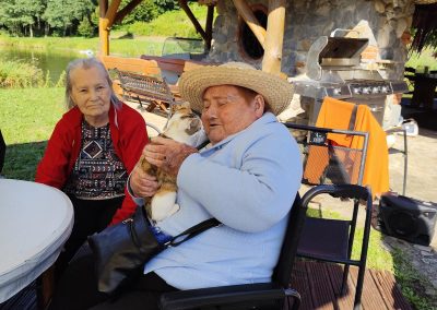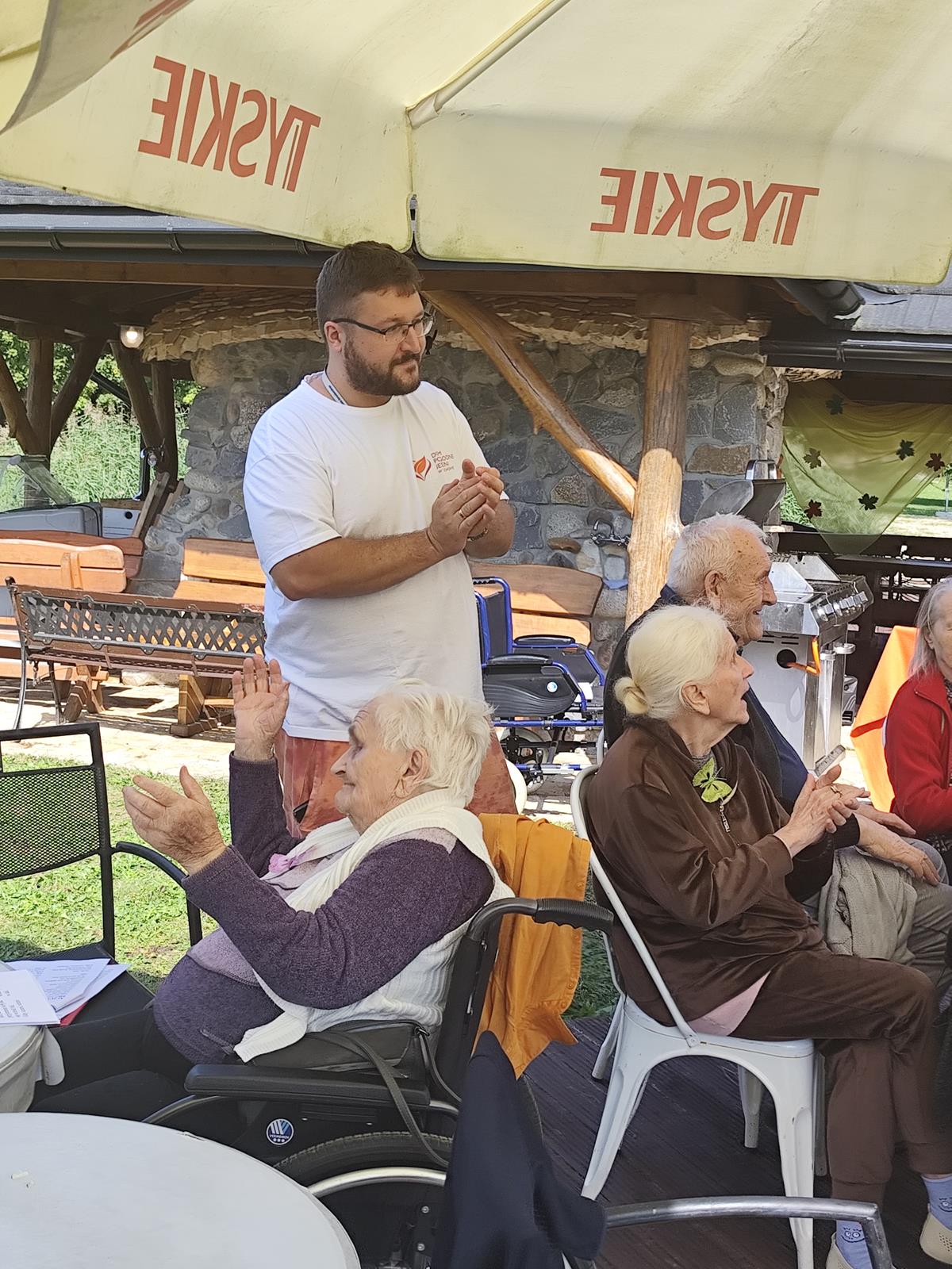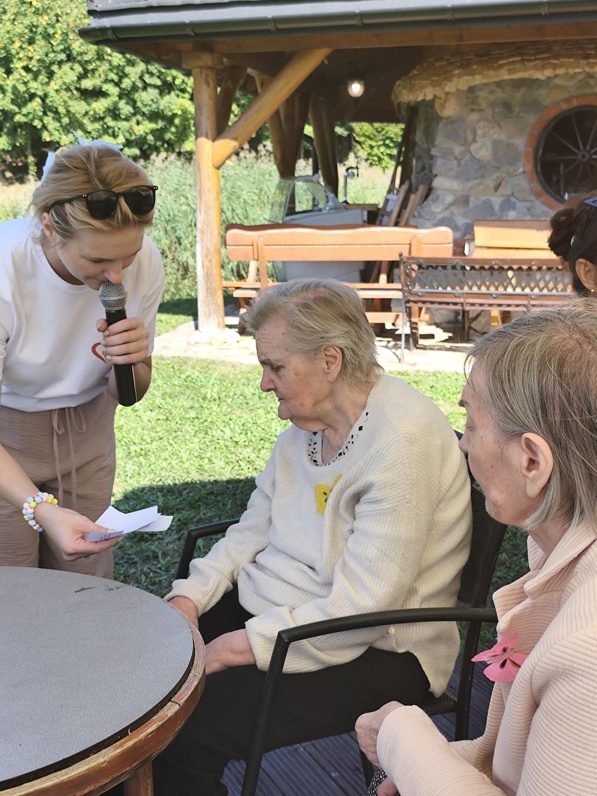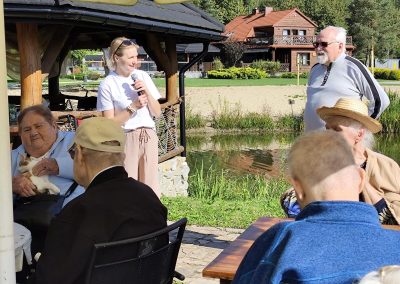 Spotkanie obfitowało w liczne atrakcje. Terapeutki zadbały o różnorodne zabawy integracyjne, które wywołały uśmiech i pozwoliły mieszkańcom aktywnie włączyć się we wspólną zabawę. Nie zabrakło również wspólnego śpiewania znanych i lubianych piosenek, co wprowadziło wszystkich w pogodny nastrój. Właściciel Eko-Sioło opowiedział uczestnikom o tym wyjątkowym miejscu, jego idei oraz codziennym funkcjonowaniu.