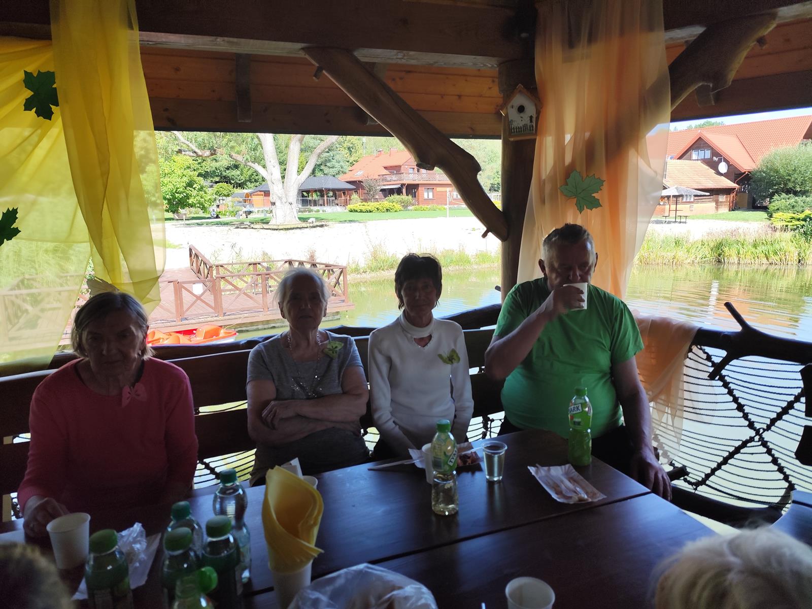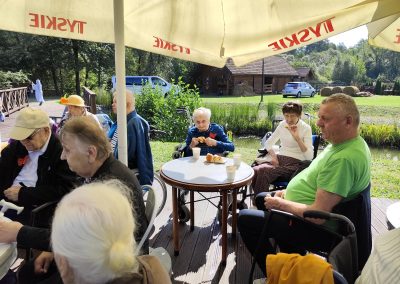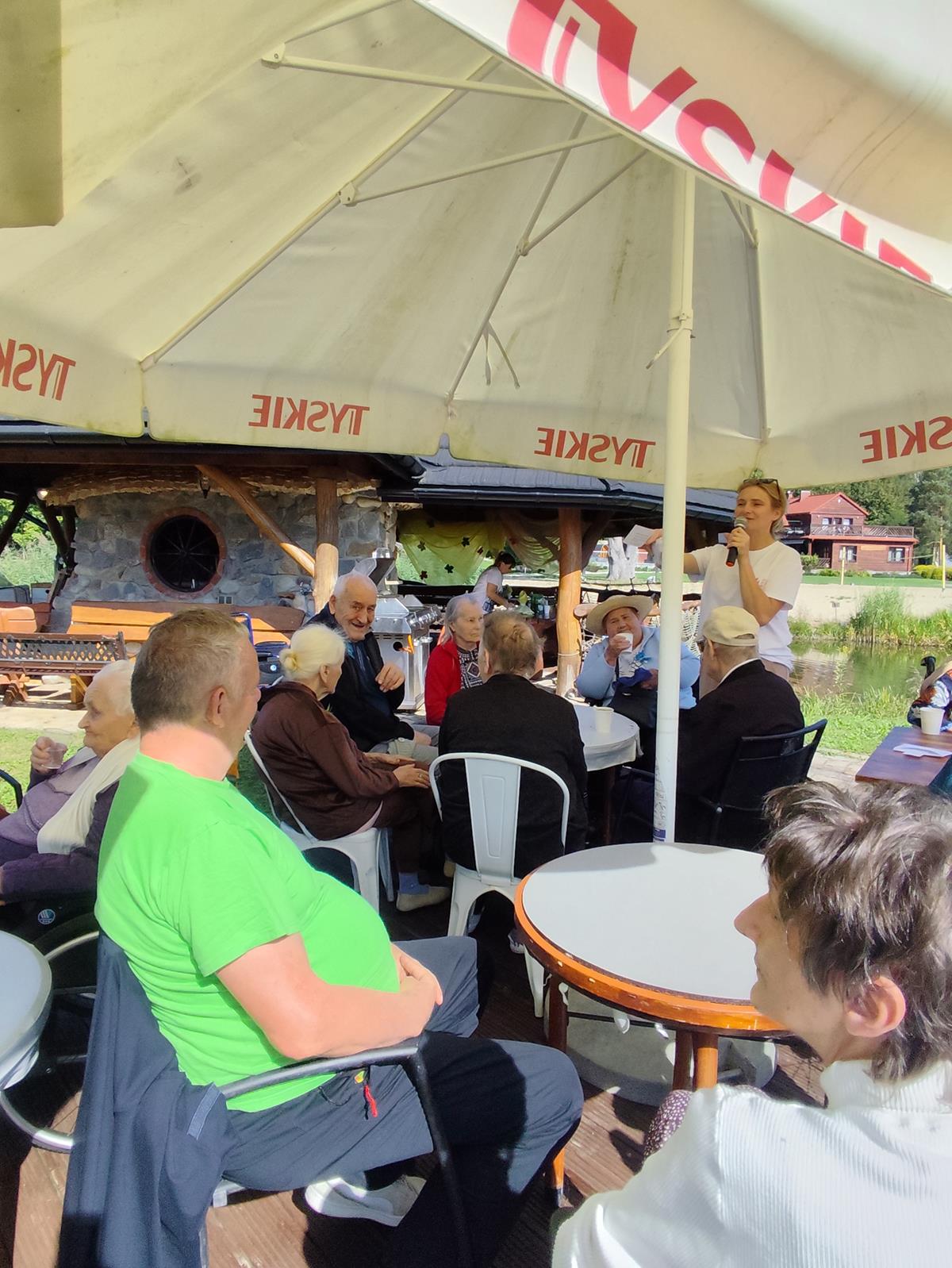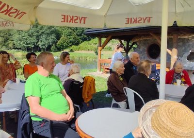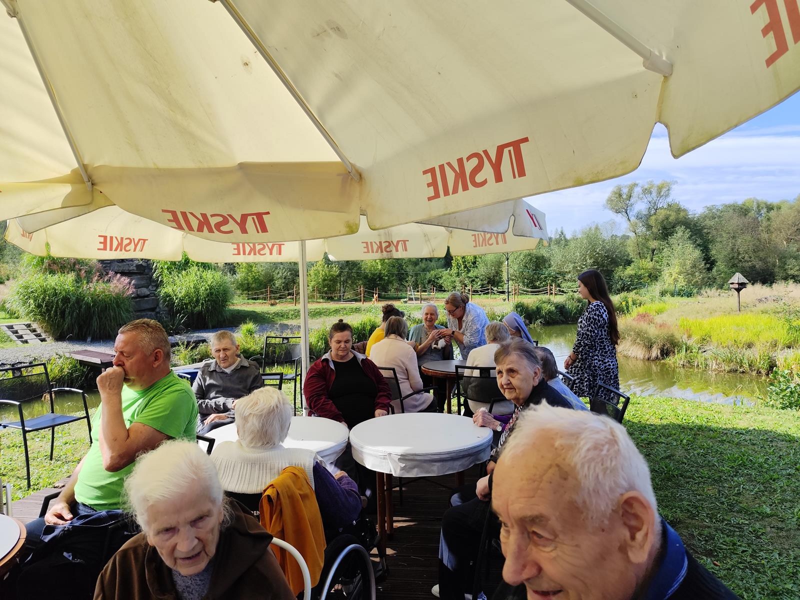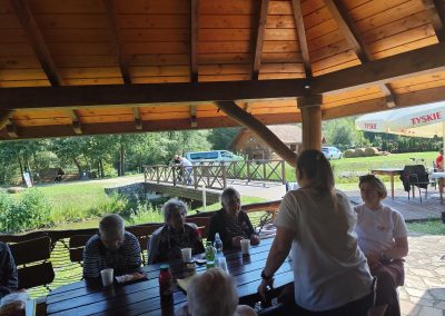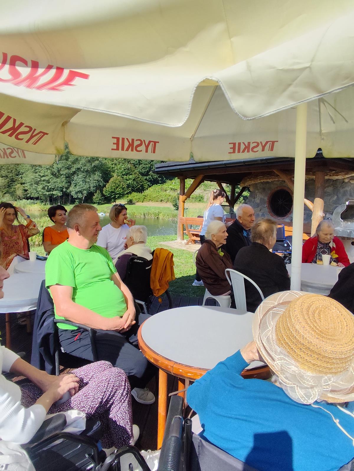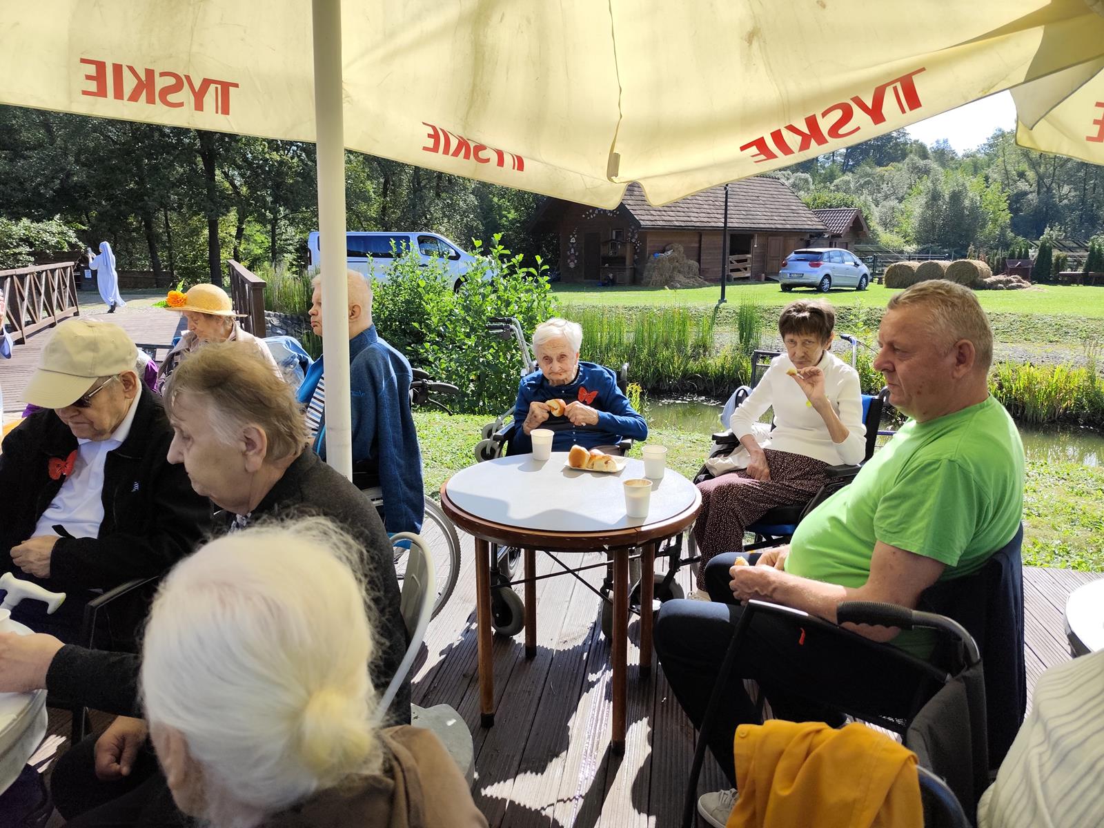 W przerwach uczestnicy mogli delektować się aromatyczną kawą i świeżą drożdżówką, a zwieńczeniem spotkania był wspólny grill, który stał się okazją do biesiadowania i radosnych rozmów przy smacznym posiłku. Spacer po terenie Eko-Sioło był doskonałą okazją do kontaktu z naturą, a także do dzielenia się wspomnieniami, do zobaczenia nowych rzeczy takich jak np. basen, jacuzzi, ponieważ dla niektórych seniorów była to zupełna nowość.  Wspólne przebywanie na świeżym powietrzu, w atmosferze spokoju i piękna przyrody, stało się źródłem wielu pozytywnych emocji i niezapomnianych wrażeń. Był to dzień pełen uśmiechu, relaksu, który na długo pozostanie w pamięci mieszkańców DPJ.