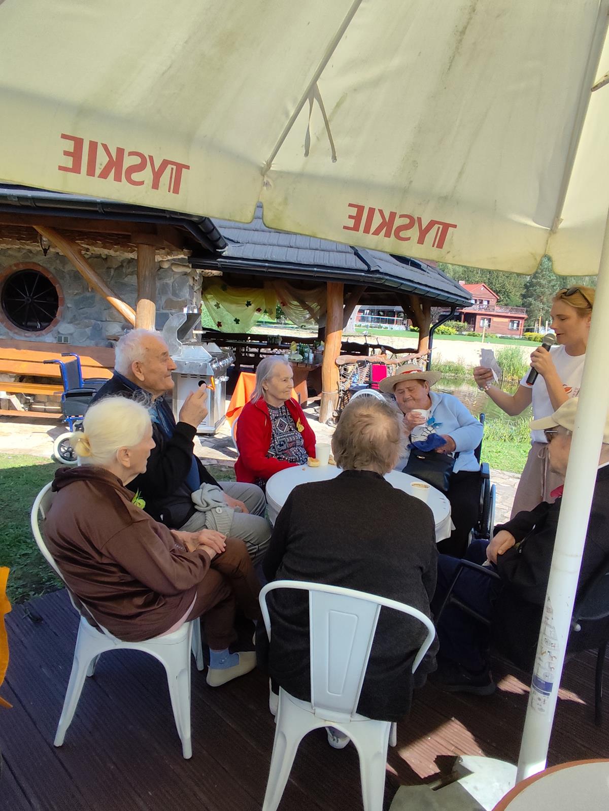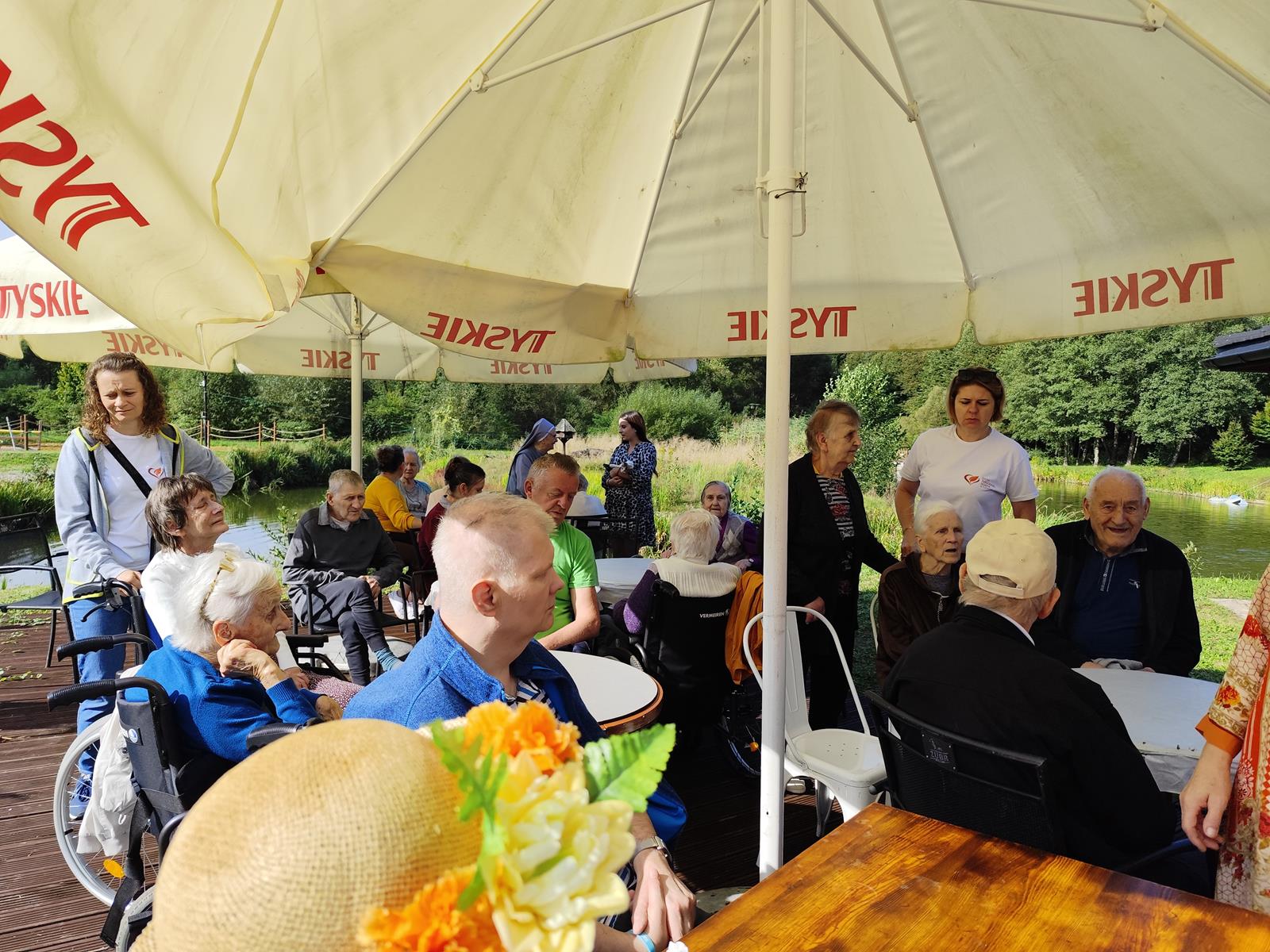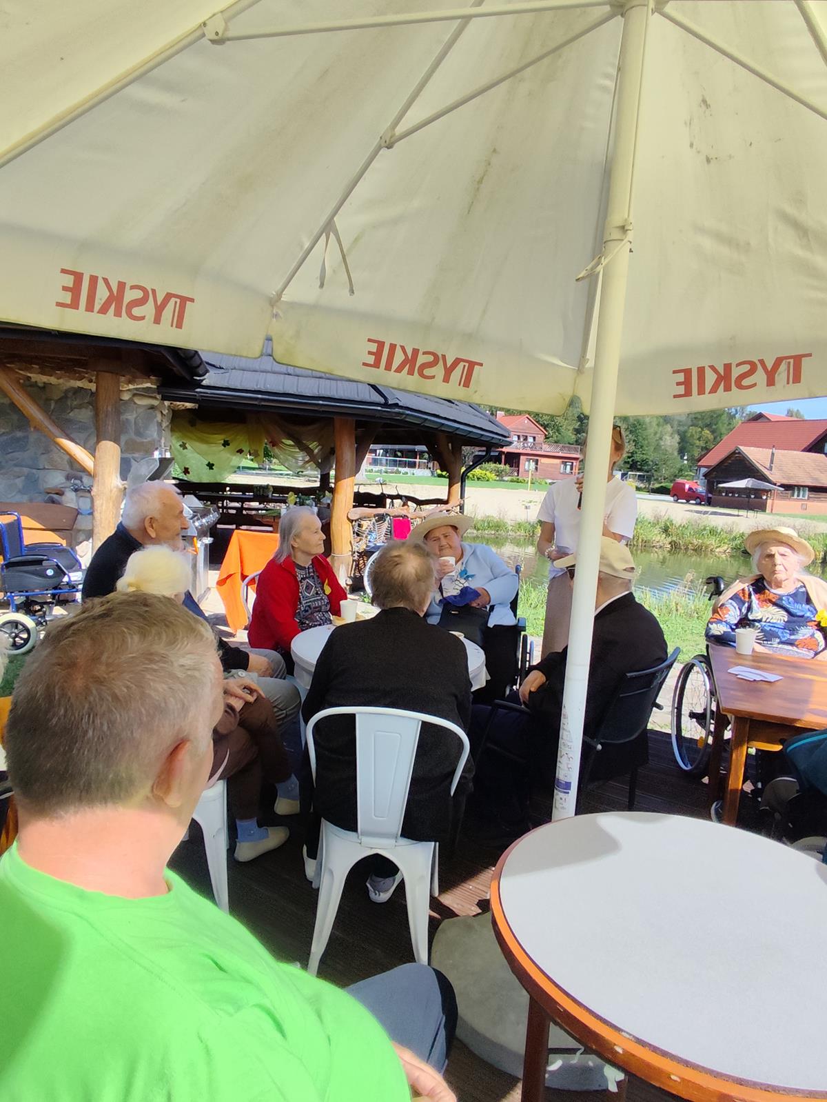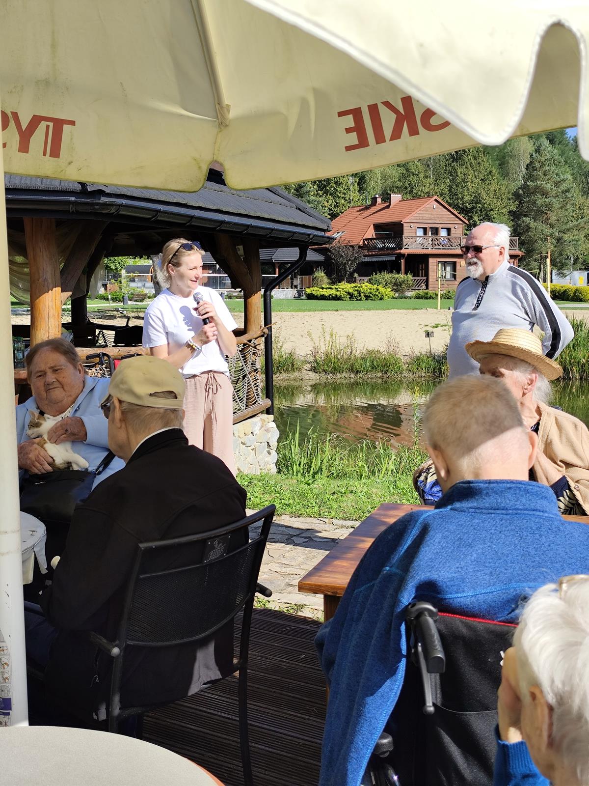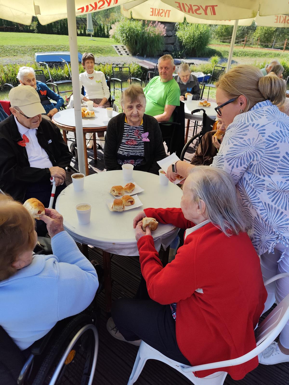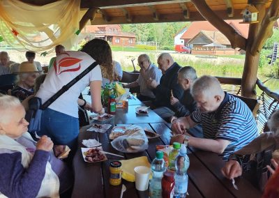 W przerwach uczestnicy mogli delektować się aromatyczną kawą i świeżą drożdżówką, a zwieńczeniem spotkania był wspólny grill, który stał się okazją do biesiadowania i radosnych rozmów przy smacznym posiłku. Spacer po terenie Eko-Sioło był doskonałą okazją do kontaktu z naturą, a także do dzielenia się wspomnieniami, do zobaczenia nowych rzeczy takich jak np. basen, jacuzzi, ponieważ dla niektórych seniorów była to zupełna nowość.  Wspólne przebywanie na świeżym powietrzu, w atmosferze spokoju i piękna przyrody, stało się źródłem wielu pozytywnych emocji i niezapomnianych wrażeń. Był to dzień pełen uśmiechu, relaksu, który na długo pozostanie w pamięci mieszkańców DPJ.