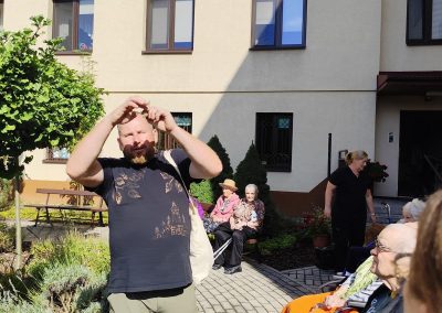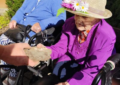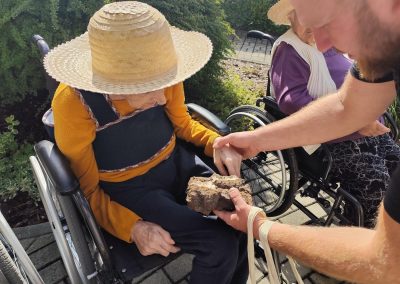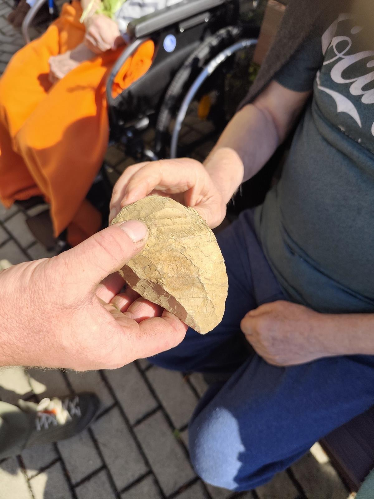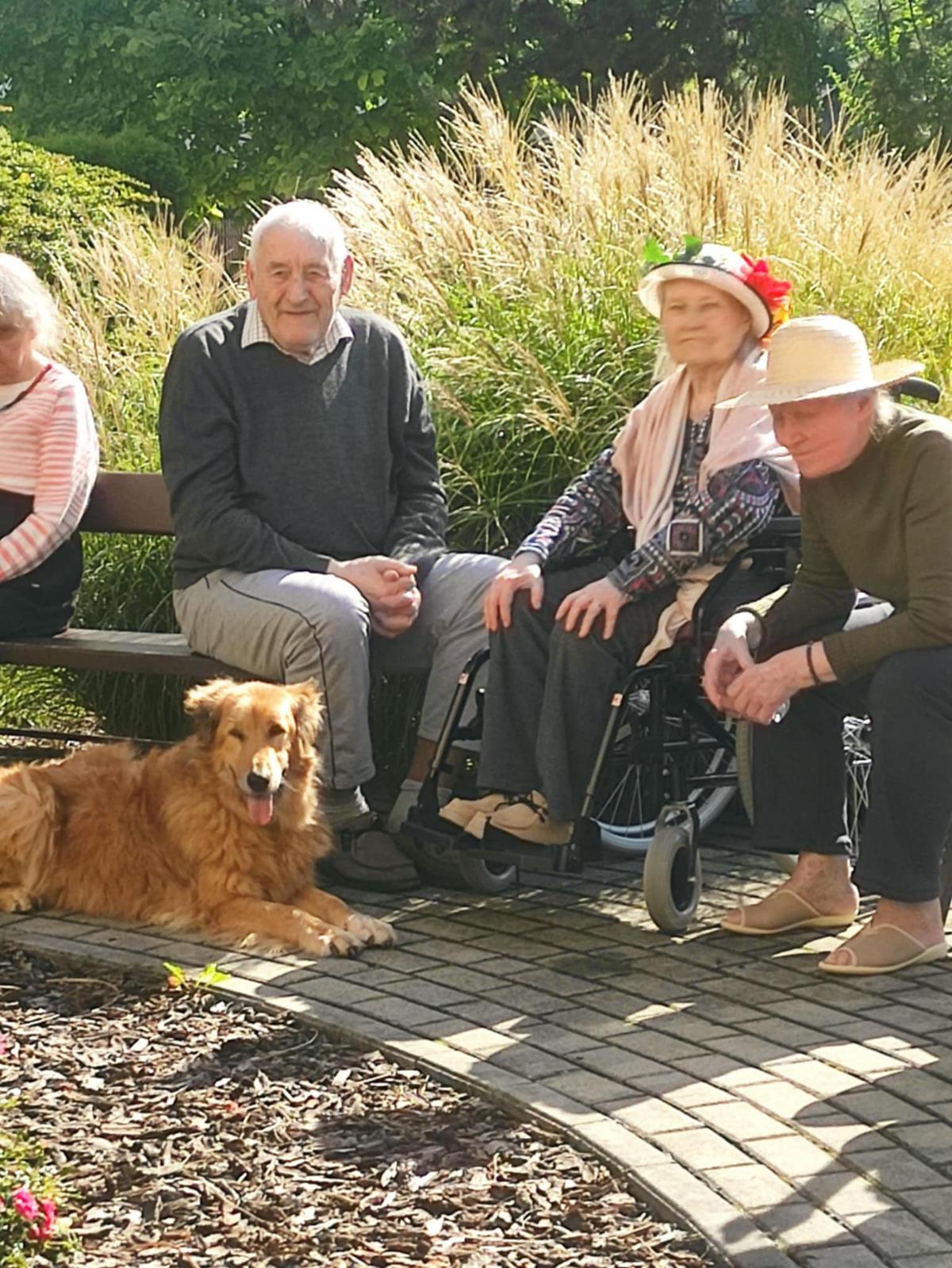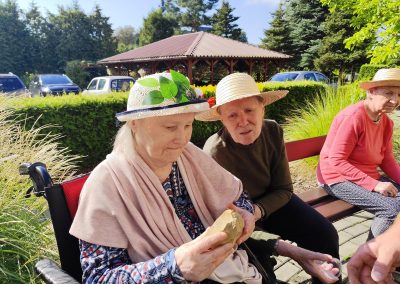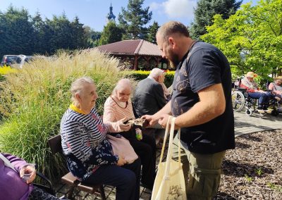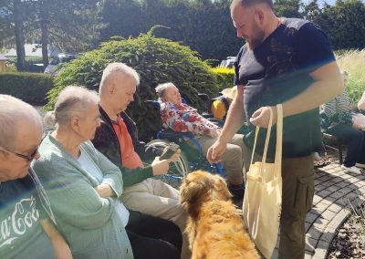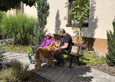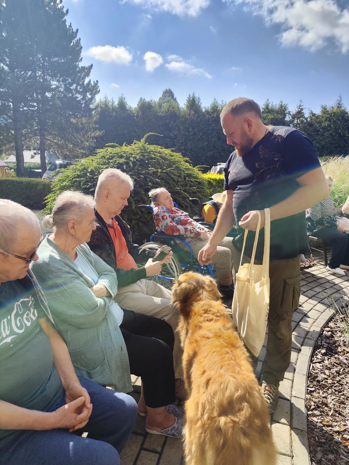 Słoneczna pogoda sprzyjała wyjściu z Domu, dlatego zajęcia dogoterapii miały dzisiaj charakter plenerowy. Pan Piotr przygotował dla mieszkańców sporo przedmiotów z różnymi fakturami ma.in.: woreczki z ziarnami, nasionami,kawałki kory, kawałki drzew, poroże młodego jelonka.