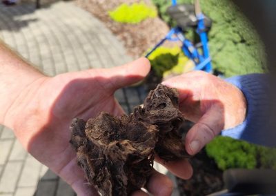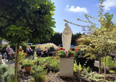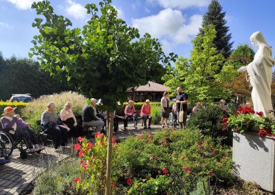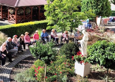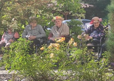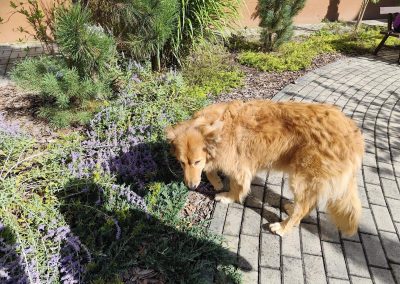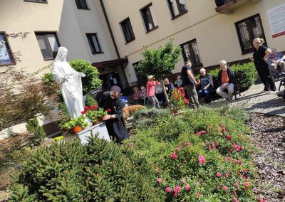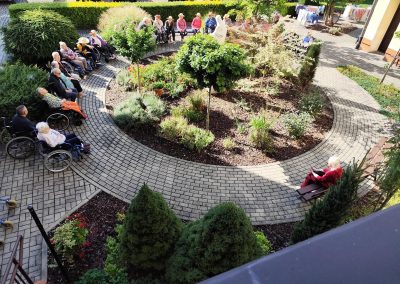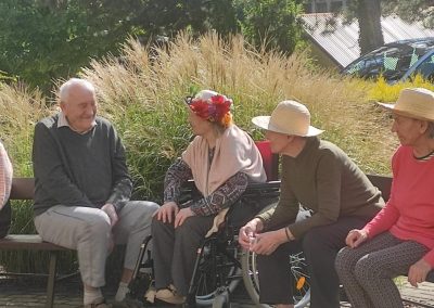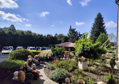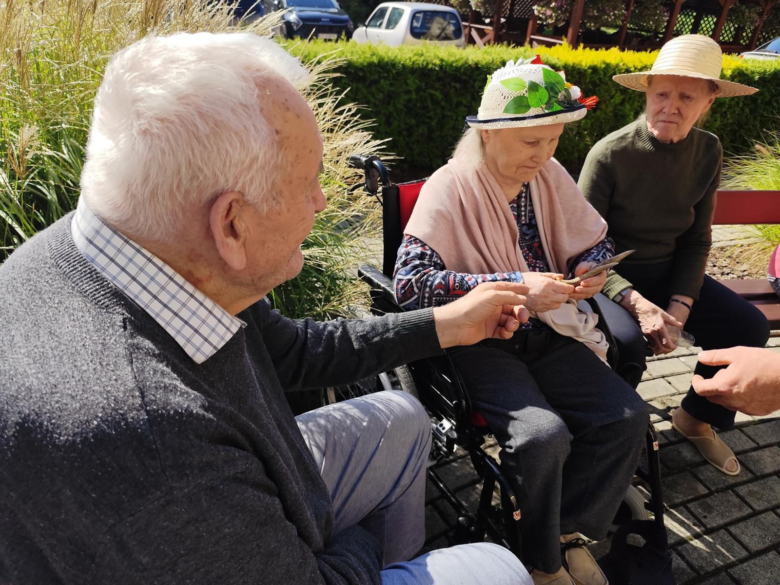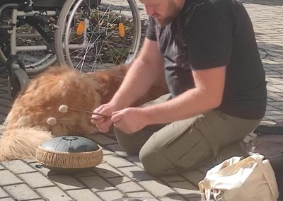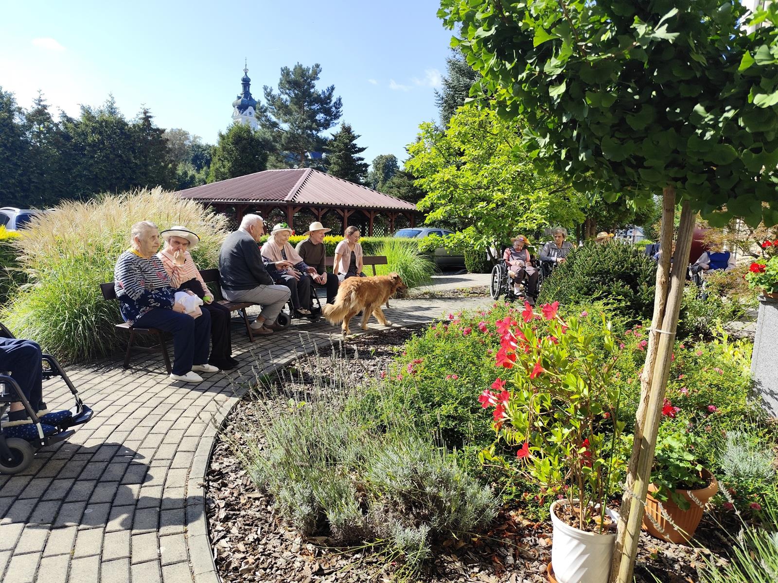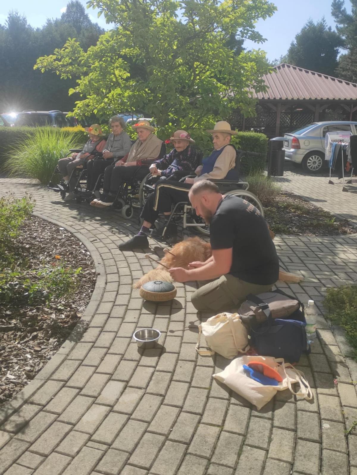 Słoneczna pogoda sprzyjała wyjściu z Domu, dlatego zajęcia dogoterapii miały dzisiaj charakter plenerowy. Pan Piotr przygotował dla mieszkańców sporo przedmiotów z różnymi fakturami ma.in.: woreczki z ziarnami, nasionami,kawałki kory, kawałki drzew, poroże młodego jelonka.