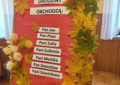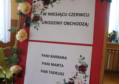 Każde spotkanie miało ciepłą i radosną atmosferę. Nieodłącznym elementem uroczystości był oczywiście tort, a także kawa i herbata. Był to czas wspólnych rozmów, śpiewu oraz zabawy, który sprzyjał integracji i budowaniu wzajemnych relacji.