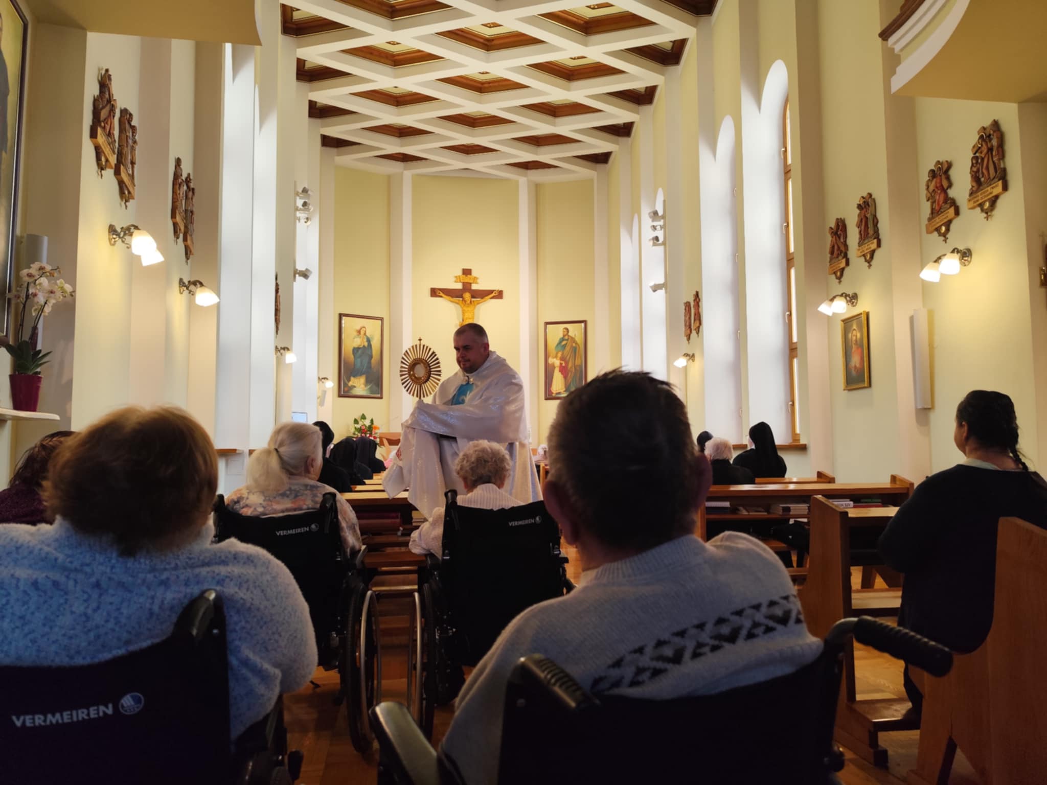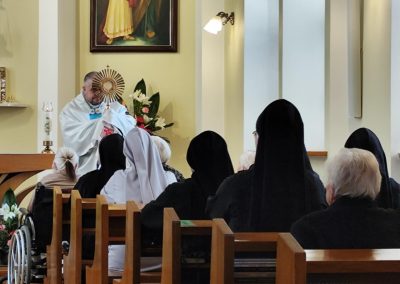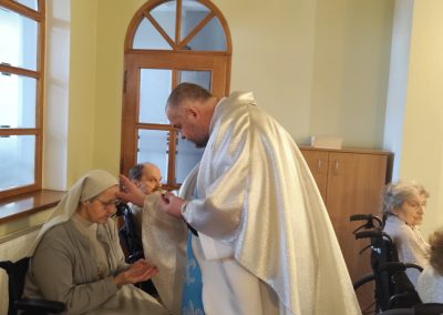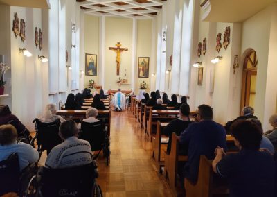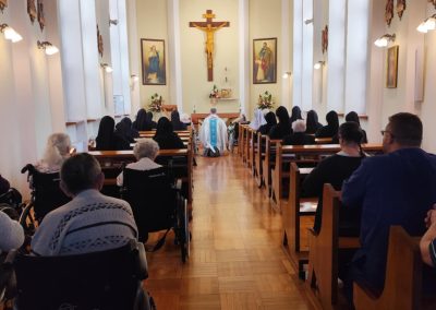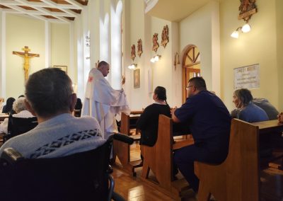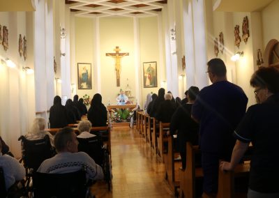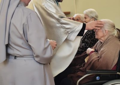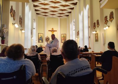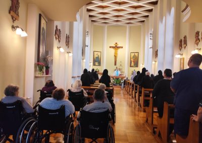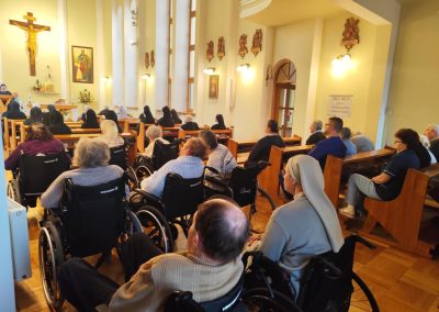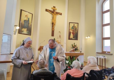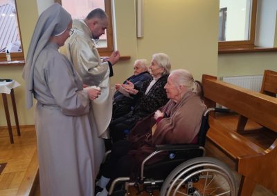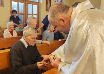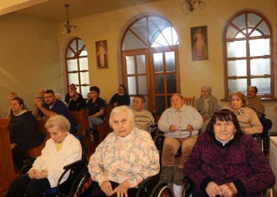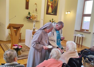 O godz. 10.30 odbyła się Msza Święta podczas której modlono się w intencji wszystkich mieszkańców Domu Pogodnej Jesieni. Liturgia miała szczególnie podniosły i pełen nadziei charakter. W homilii o. Ludwik Łabuda- kapelan DPJ podkreślił, że cierpienie, choć trudne i często niezrozumiałe, może stać się przestrzenią spotkania z Bogiem i drugim człowiekiem. Zwrócił uwagę na to, jak ważne jest wsparcie duchowe oraz zwykła ludzka obecność.