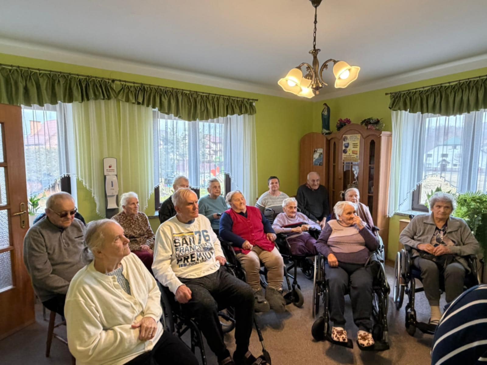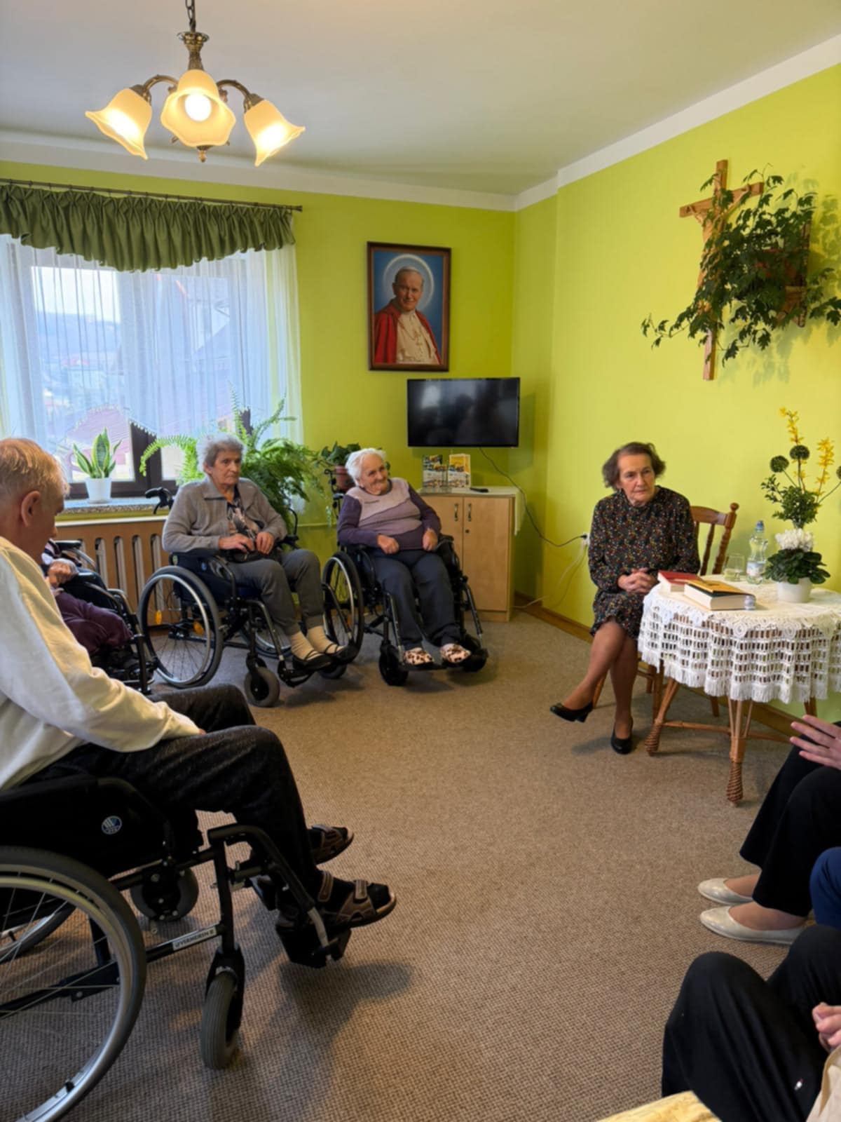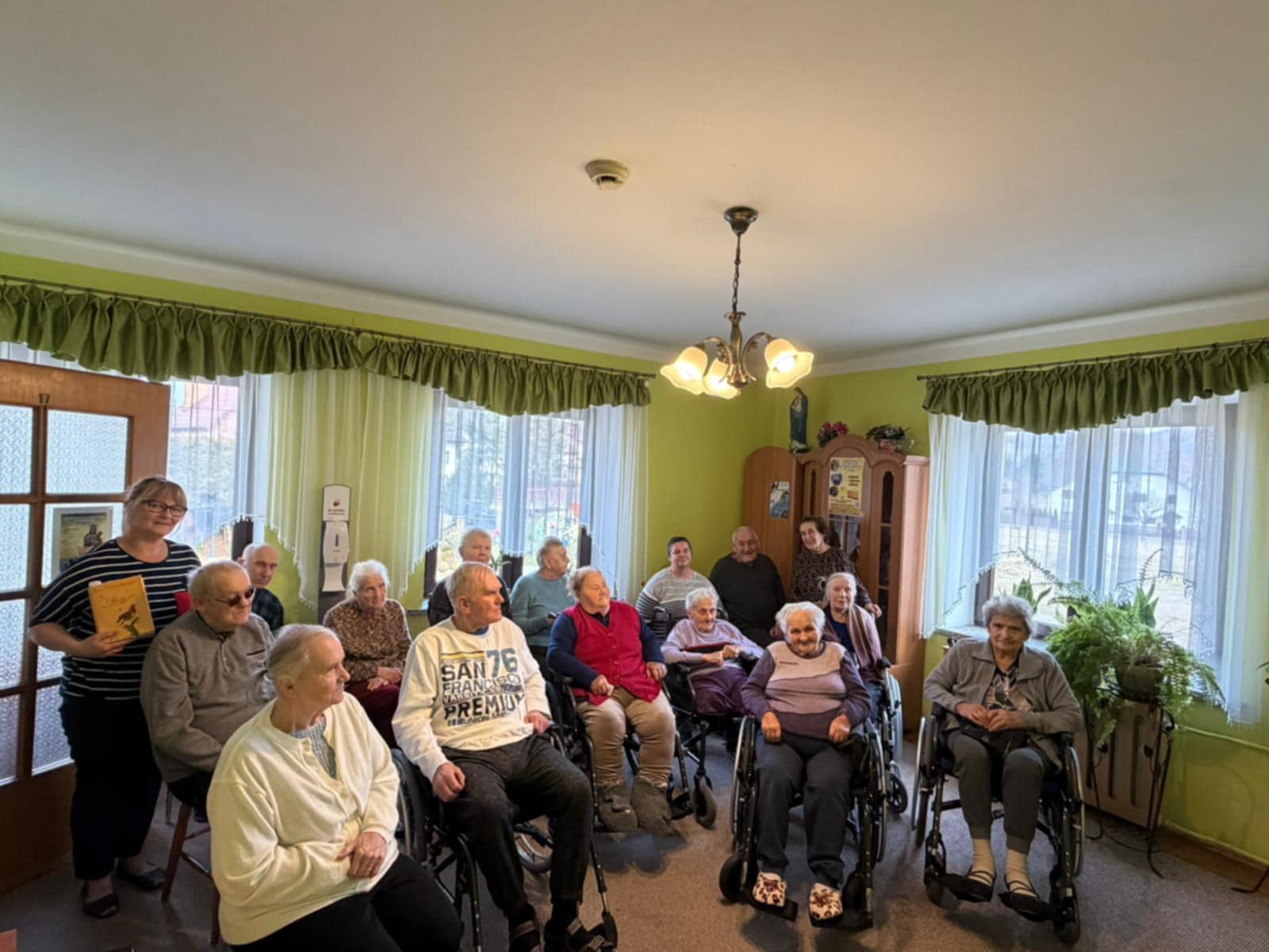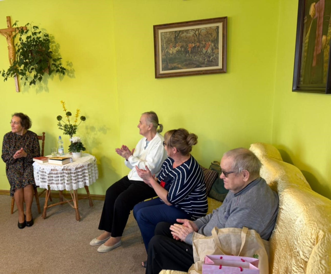 Kilkunastoosobowe grono mieszkańców nie tylko podjęło z gościem ciekawe rozmowy, ale wysłuchało fragmentów książek. W ramach akcji „ Z książką do DPJ” p. Ewa czytała „Piórka prawie wszystkie” Jana Sztaudyngera oraz „A w Krakowie na Brackiej pada deszcz” Michała Zabłockiego, laureata Festiwalu w Opolu 2024 jako twórcy i współwykonawcy z Czesławem Mozilem piosenki „Ławeczka”