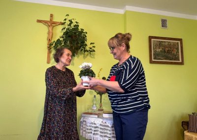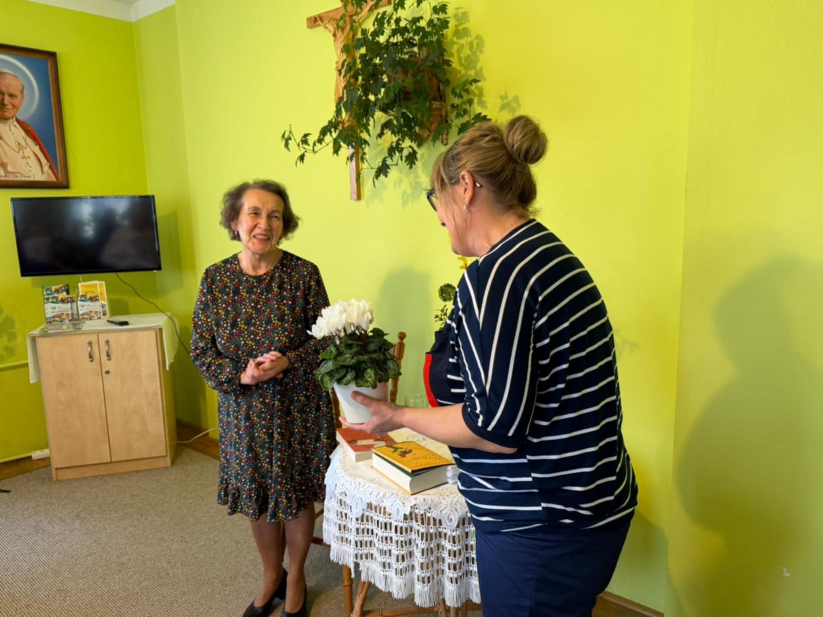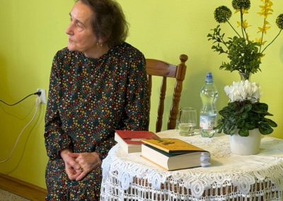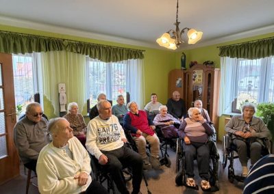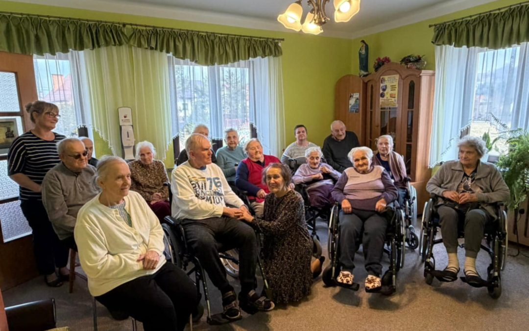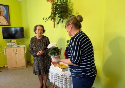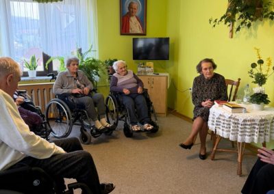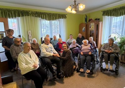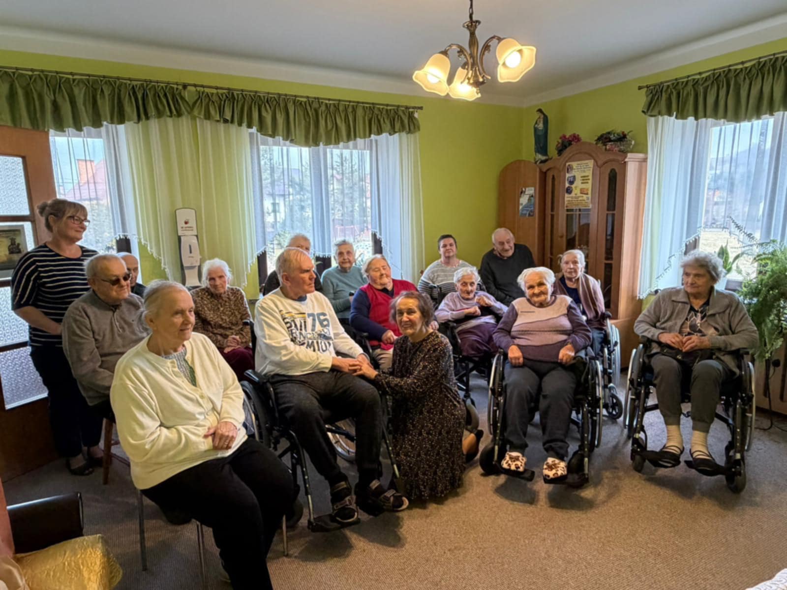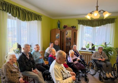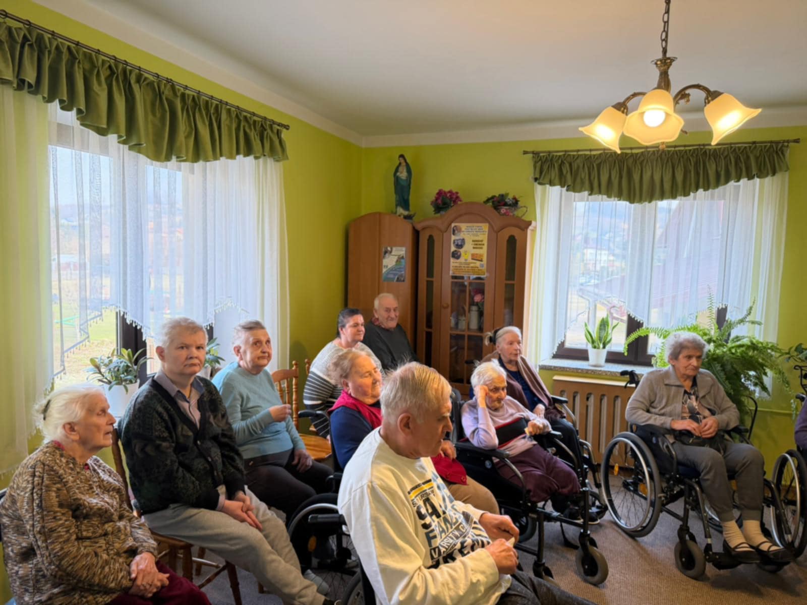 Kilkunastoosobowe grono mieszkańców nie tylko podjęło z gościem ciekawe rozmowy, ale wysłuchało fragmentów książek. W ramach akcji „ Z książką do DPJ” p. Ewa czytała „Piórka prawie wszystkie” Jana Sztaudyngera oraz „A w Krakowie na Brackiej pada deszcz” Michała Zabłockiego, laureata Festiwalu w Opolu 2024 jako twórcy i współwykonawcy z Czesławem Mozilem piosenki „Ławeczka”