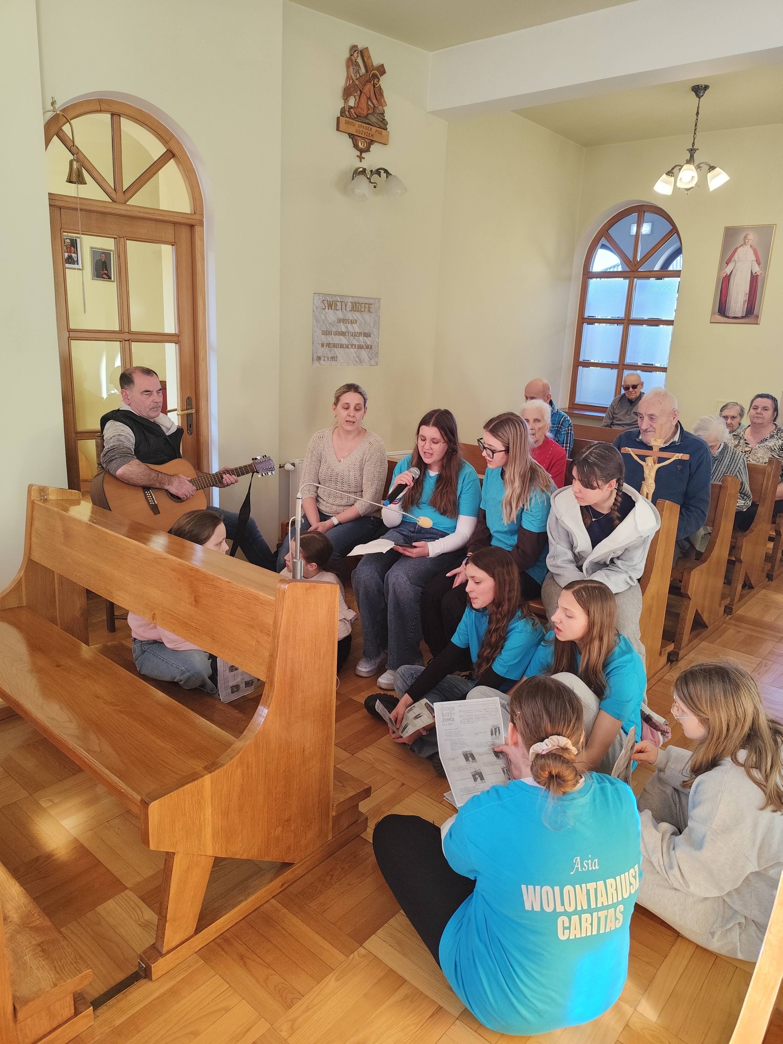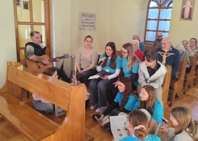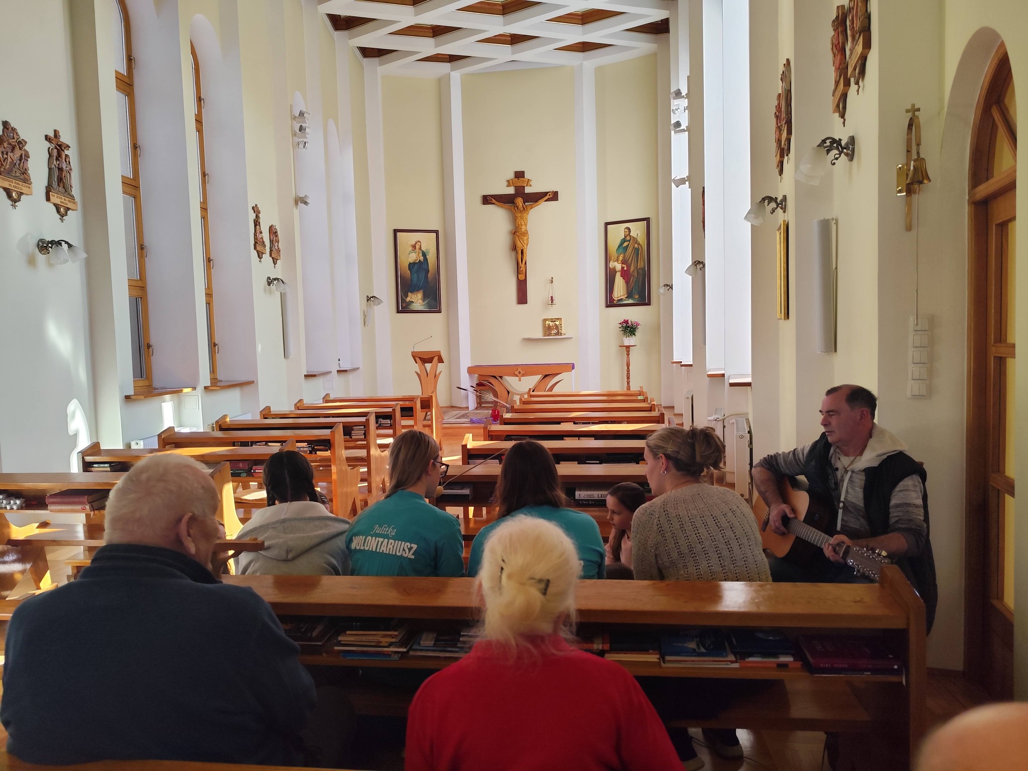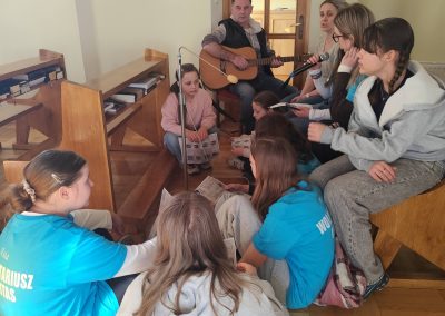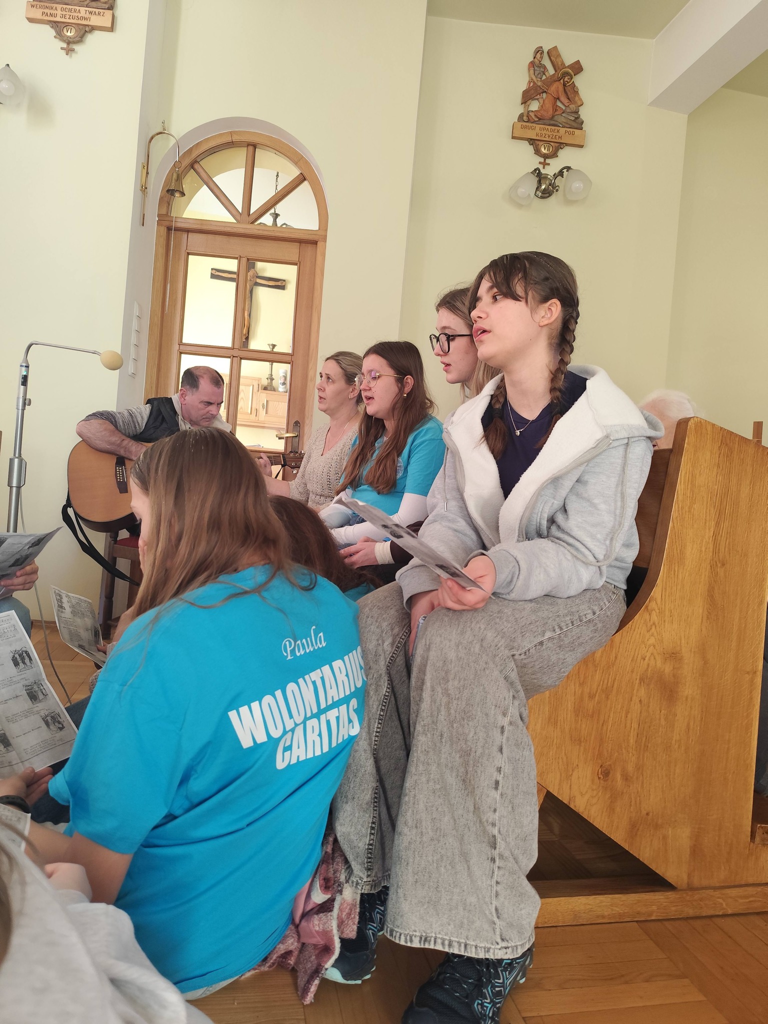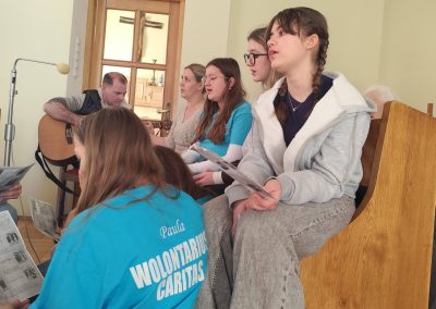 Nasi goście przygotowali piękną, śpiewaną Drogę Krzyżową, która poruszyła serca wszystkich obecnych. Pan Piotr akompaniował na gitarze, a wspólny śpiew stworzył niezwykłą, modlitewną atmosferę. Każda stacja była przeżywana bardzo uroczyście, a po niej rozbrzmiewał refren: